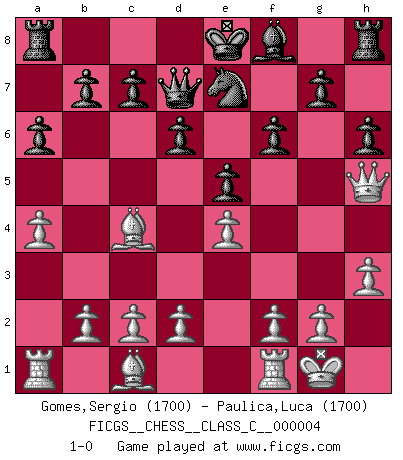 Last move : 1-0 2006 August 21 6:27:16 [Event "FICGS__CHESS__CLASS_C__000004"] [Site "FICGS"] [Date "2006.05.16"] [Round "1"] [White "Gomes,Sergio"] [Black "Paulica,Luca"] [Result "1-0"] [WhiteElo "1700"] [BlackElo "1700"] 1.e4 e5 2.Nf3 Nc6 3.Bb5 f6 4.O-O a6 5.Bc4 Nge7 6.Nc3 d6 7.a4 Bg4 8.h3 Bxf3 9.Qxf3 Nd4 10.Qd1 h6 11.Ne2 Nxe2+ 12.Qxe2 Qd7 13.Qh5+ 1-0 This chess game has been lost on time (started : 2006.05.16 12:13:29) Ruy Lopez : Nuernberg variation Kingside Castling by player White (move 4) Player White won this chess game. Follow this game move after move (download)There are two classes of men; those who are content to yield to circumstances and who play whist; those who aim to control circumstances, and who play Chess. (Mortimer Collins) Fischer machte Schach einfach zu einer aufregenden Sache, wann immer er sich ans Brett setzte. (Raymond Keene) Todos los Maestros de Ajedrez fueron un día unos principiantes. (Chernev) Les Echecs ne sont pas pour les âmes timides. Ils requièrent un homme entier, qui ne s'arrête pas aveuglément à ce qui a été déjà établi, mais qui tente individuellement de sonder les profondeurs du jeu. (W. Steinitz) The smarter you play, the luckier you'll be. (Mark Pilarski)