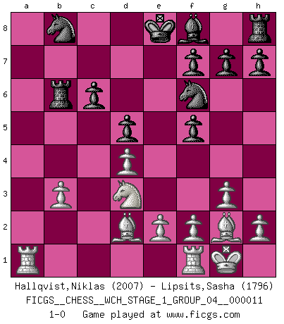 Last move : 1-0 2013 January 14 0:20:2 [Event "FICGS__CHESS__WCH_STAGE_1_GROUP_04__000011"] [Site "FICGS"] [Date "2012.11.01"] [Round "1"] [White "Hallqvist,Niklas"] [Black "Lipsits,Sasha"] [Result "1-0"] [WhiteElo "2007"] [BlackElo "1796"] 1.d4 d5 2.g3 Bf5 3.Bg2 Nf6 4.c4 e6 5.Nc3 c6 6.Qb3 Qb6 7.Nf3 Nbd7 8.c5 Qa6 9.Nh4 b6 10.Nxf5 exf5 11.cxb6 axb6 12.O-O b5 13.a4 b4 14.Na2 Qxa4 15.Qxa4 Rxa4 16.Bd2 Nb8 17.b3 Ra6 18.Nxb4 Rb6 19.Nd3 1-0 This chess game has been lost on time (started : 2012.11.01 17:11:49) Queen's pawn game Kingside Castling by player White (move 12) Player White won this chess game. Follow this game move after move (download)All I want to do, ever, is just play Chess. (Bobby Fischer) Wenn Capablanka heute auf der Schachbühne erscheinen würde, hätte er ein halbes Jahr gebraucht um sich die Schachtheorie anzueignen. Und dann hätte er alles und jeden besiegt. (Mikhail Moiseyevich Botvinik) Yo he agregado estos principios a la ley: pongan los Caballos en acción antes de que los dos Alfiles sean desarrollados. (Emanuel Lasker) Roi des jeux et jeu des rois, les échecs portent en eux un sentiment d'infini. Ils donnent à celui qui s'est efforcé d'en approfondir les arcanes l'impression de n'être pas à la mesure de l'homme; en fait, ils constituent un résumé de l'univers, un microcosme, et figurent cette grande échelle qui, dans les plans de la lumière descend jusqu'à la matière, qui des abîmes insondables remonte jusqu'en l'infini de Dieu. (Pyrame) A good programmer is someone who always looks both ways before crossing a one-way street. (Doug Linder)