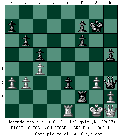 Last move : 0-1 2013 February 5 13:48:52 [Event "FICGS__CHESS__WCH_STAGE_1_GROUP_04__000011"] [Site "FICGS"] [Date "2012.11.01"] [Round "1"] [White "Mohandoussaid,Malik"] [Black "Hallqvist,Niklas"] [Result "0-1"] [WhiteElo "1641"] [BlackElo "2007"] 1.c4 b6 2.Nf3 Bb7 3.Nc3 e6 4.g3 Nc6 5.Bg2 Ne5 6.d3 Nxf3+ 7.Bxf3 Bxf3 8.exf3 Nf6 9.O-O Be7 10.Ne4 O-O 11.Bg5 Nxe4 12.Bxe7 Nxf2 13.Rxf2 Qxe7 14.Qd2 Rfd8 15.f4 d5 16.Qc2 dxc4 17.dxc4 Rd4 18.Rd1 c5 19.Re1 Rad8 20.f5 e5 21.f6 gxf6 22.Ref1 R8d6 23.b3 Qd7 24.Qe2 Qh3 25.Qe3 Kg7 26.Rf5 Rd3 27.Qe4 Rd2 28.Qh1 e4 29.R5f4 R6d3 30.R4f2 Rxf2 31.Kxf2 Rd2+ 32.Kg1 e3 33.Re1 Rf2 34.a3 h5 0-1 This chess game has been lost on time (started : 2012.11.01 17:11:49) English Opening Kingside Castling by player White (move 9) Kingside Castling by player Black (move 10) Player Black won this chess game. Follow this game move after move (download)Chess is a terrible game. If you have no center, your opponent has a freer position. If you do have a center, then you really have something to worry about ! (Siegbert Tarrasch) Kleine Schachspieler machen Mist, und große Schachspieler machen Mist, aber große machen weniger Mist. (Fritz Sämisch) El Ajedrez es 99 por ciento táctica. (Teichmann) Vous n'êtes pas toujours obligé de jouer le meilleur coup. Un coup doit être actif, entreprenant, correct et beau ! (David Bronstein) Pretend inferiority and encourage his arrogance. (Sun Tzu)