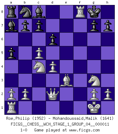 Last move : 1-0 2013 January 1 16:17:41 [Event "FICGS__CHESS__WCH_STAGE_1_GROUP_04__000011"] [Site "FICGS"] [Date "2012.11.01"] [Round "1"] [White "Roe,Philip"] [Black "Mohandoussaid,Malik"] [Result "1-0"] [WhiteElo "1952"] [BlackElo "1641"] 1.Nc3 Nf6 2.e4 e5 3.f4 Bc5 4.fxe5 Nxe4 5.Nxe4 Qh4+ 6.Ng3 O-O 7.Nf3 Qg4 8.d4 Bb6 9.Be2 f6 10.Be3 Qe6 11.Qd2 Qd5 12.O-O a5 13.c4 Qf7 14.c5 Ba7 15.exf6 Qxf6 16.Ne5 Qe6 17.Bc4 Qxc4 18.Nxc4 d6 19.Rxf8+ 1-0 Dunst (Sleipner, Heinrichsen) Opening Kingside Castling by player Black (move 6) Kingside Castling by player White (move 12) Player White won this chess game. Follow this game move after move (download)A bad day of Chess is better than any good day at work. (Anonymous) Ein Buch ist ein Spiegel; wenn ein Affe hineinsieht, so kann kein Apostel heraus gucken. (Georg Christoph Lichtenberg) Después de la respuesta de las negras a 1.e4 con 1..e5, se quedan siempre tratando de entrar dentro del juego. (Howard Staunton) Karpov est une pièce de musée. (Garry Kasparov) Fame, I have already. Now I need the money. (an elderly Steinitz)