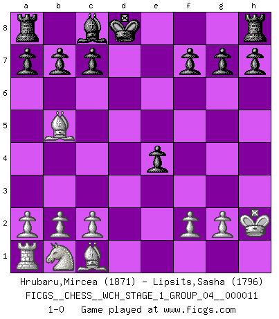 Last move : 1-0 2013 January 14 0:20:2 [Event "FICGS__CHESS__WCH_STAGE_1_GROUP_04__000011"] [Site "FICGS"] [Date "2012.11.01"] [Round "1"] [White "Hrubaru,Mircea"] [Black "Lipsits,Sasha"] [Result "1-0"] [WhiteElo "1871"] [BlackElo "1796"] 1.e4 e5 2.Nf3 Nc6 3.Bb5 Nf6 4.O-O Nxe4 5.d4 exd4 6.Re1 d5 7.Nxd4 Bd6 8.Nxc6 Bxh2+ 9.Kh1 Qh4 10.Rxe4+ dxe4 11.Qd8+ Qxd8 12.Nxd8 Kxd8 13.Kxh2 1-0 This chess game has been lost on time (started : 2012.11.01 17:11:49) Ruy Lopez : Berlin defense, Open variation Kingside Castling by player White (move 4) Player White won this chess game. Follow this game move after move (download)Do you realize Fischer almost never has any bad pieces? He exchanges them, and the bad pieces remain with his opponents. (Yuri Balashov) Man kann eine Schachpartie nur gewinnen, wenn das Gleichgewicht gestört ist. In einer Stellung mit ungestörtem Gleichgewicht ist auch das größte Genie hilflos - in der Stellung steckt dann eben kein genialer Einfall. (Wilhelm Steinitz) La batalla por la última verdad nunca sera ganada. Y es por eso que el Ajedrez es tan fascinante. (Hans Kmoch) Même un GMI sait rarement calculer sur plus de cinq coups une attaque à sacrifices. (Rudolf Spielmann) Luck is when opportunity knocks and you answer. (Anonymous)