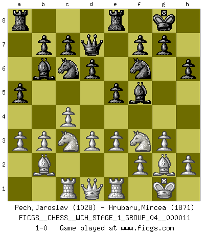 Last move : 1-0 2013 February 6 14:0:55 [Event "FICGS__CHESS__WCH_STAGE_1_GROUP_04__000011"] [Site "FICGS"] [Date "2012.11.01"] [Round "1"] [White "Pech,Jaroslav"] [Black "Hrubaru,Mircea"] [Result "1-0"] [WhiteElo "1028"] [BlackElo "1871"] 1.c4 Nf6 2.Nc3 e5 3.Nf3 Nc6 4.g3 Bc5 5.Bg2 d6 6.d3 h6 7.O-O O-O 8.a3 a5 9.e3 Bb6 10.b3 Bf5 11.Bb2 Re8 12.Rc1 Qd7 13.Re1 1-0 This chess game has been lost on time (started : 2012.11.01 17:11:49) English Opening Kingside Castling by player White (move 7) Kingside Castling by player Black (move 7) Player White won this chess game. Follow this game move after move (download)If you aren't afraid of Spassky, then I have removed the element of money. (Jim Slater) Im Reiche der Wirklichkeit ist man nie so glücklich wie im Reiche der Gedanken. (Arthur Schopenhauer) ¿Porque tengo que perder ante este idiota?. (Aron Nimzovich) La vérité est comme le meilleur coup aux échecs : elle existe, mais il faut la chercher. (Arturo Perez-Reverte) Experiences are the keys to life. (Daniel Parmet)