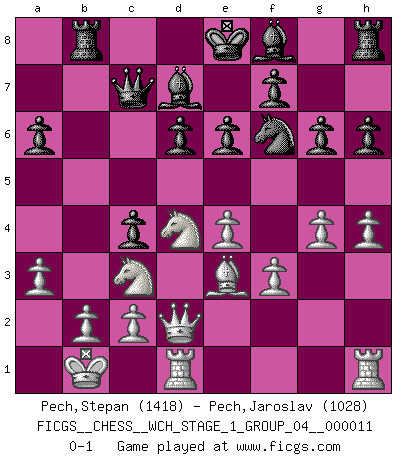 Last move : 0-1 2013 April 1 8:8:46 [Event "FICGS__CHESS__WCH_STAGE_1_GROUP_04__000011"] [Site "FICGS"] [Date "2012.11.01"] [Round "1"] [White "Pech,Stepan"] [Black "Pech,Jaroslav"] [Result "0-1"] [WhiteElo "1418"] [BlackElo "1028"] 1.e4 c5 2.Nf3 Nc6 3.d4 cxd4 4.Nxd4 Nf6 5.Nc3 d6 6.Bg5 e6 7.Qd2 a6 8.O-O-O Bd7 9.f3 h6 10.Be3 b5 11.g4 Ne5 12.a3 Qc7 13.h4 Rb8 14.Kb1 g6 15.Be2 Nc4 16.Bxc4 bxc4 0-1 This chess game has been lost on time (started : 2012.11.01 17:11:49) Sicilian defense Queenside Castling by player White (move 8) Player Black won this chess game. Follow this game move after move (download)The passed pawn is a criminal, who should be kept under lock and key. Mild measures, such as police surveillance, are not sufficient. (Nimzovitch) Ich habe kein Problem mit Frauen, sondern nur mit dem Niveau ihres Schachspiels (Judith Polgar) El Ajedrez es una guerra en un tablero. El objetivo es aplastar la mente del oponente. (Bobby Fischer) Fischer est le meilleur joueur du monde et Karpov n'est qu'un joueur de bistrot. (Garry Kasparov, agé de 16 ans) Knowledge rests not upon truth alone, but upon error also. (Carl G. Jung)