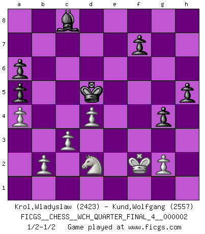 Last move : 1/2-1/2 2007 March 28 8:42:17 [Event "FICGS__CHESS__WCH_QUARTER_FINAL_4__000002"] [Site "FICGS"] [Date "2007.01.16"] [Round "4"] [White "Krol,Wladyslaw"] [Black "Kund,Wolfgang"] [Result "1/2-1/2"] [WhiteElo "2423"] [BlackElo "2557"] 1.e4 e5 2.f4 exf4 3.Nf3 g5 4.h4 g4 5.Ne5 Nf6 6.Bc4 d5 7.exd5 Bd6 8.O-O Bxe5 9.d4 Bd6 10.Qe1+ Be7 11.Bxf4 Nxd5 12.Qe5 Nf6 13.Nc3 Nbd7 14.Qe3 Nb6 15.Bb3 O-O 16.Bh6 Kh8 17.Rad1 c6 18.Bxf8 Qxf8 19.Rde1 Bd8 20.a4 a5 21.h5 Ra6 22.h6 Nbd5 23.Qg5 Ng8 24.Qe5+ Bf6 25.Rxf6 Ndxf6 26.Ne4 c5 27.Bc4 Qxh6 28.Bxa6 bxa6 29.Nxc5 Qd2 30.Rf1 Kg7 31.c3 h5 32.Rxf6 Nxf6 33.Qxf6+ Kxf6 34.Ne4+ Ke6 35.Nxd2 Kd5 36.Kf2 1/2-1/2 KGA : Kieseritsky, Berlin defense, 6.Bc4 Kingside Castling by player White (move 8) Kingside Castling by player Black (move 15) This chess game ended in a draw. Follow this game move after move (download)If cunning alone were needed to excel, women would be the best Chess players. (Albin) Das Schachspiel ist ein See, in welchem eine Mücke baden und ein Elefant ertrinken kann. (Emanuel Lasker) Solo los afeminados hacen el Enroque. (Rob Sillars) Les échecs sont un jeu par leur forme, un art par leur essence et une science par sa difficulté d'acquisition. Ils peuvent vous procurer autant de plaisir qu'un bon livre ou une belle musique, mais vous n'aurez une réelle joie que si vous arrivez à bien jouer. (Tigran Petrosian) The only thing that matters is the evidence. (Horatio Caine, C.S.I. Miami)