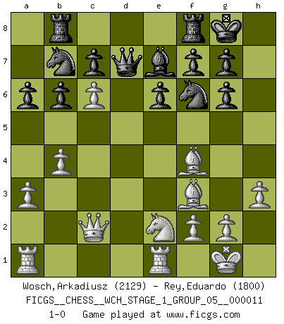 Last move : 1-0 2012 December 21 19:49:52 [Event "FICGS__CHESS__WCH_STAGE_1_GROUP_05__000011"] [Site "FICGS"] [Date "2012.12.01"] [Round "1"] [White "Wosch,Arkadiusz"] [Black "Rey,Eduardo"] [Result "1-0"] [WhiteElo "2129"] [BlackElo "1800"] 1.e4 d5 2.exd5 Nf6 3.d4 Nxd5 4.Nf3 Bg4 5.Be2 Nc6 6.O-O e6 7.c4 Nf6 8.Be3 Be7 9.Nc3 O-O 10.h3 Bf5 11.Nh4 Bg6 12.Nxg6 hxg6 13.a3 a6 14.Qd2 Na5 15.Qc2 Nd7 16.Rfe1 b6 17.b4 Nb7 18.Bf3 Rb8 19.c5 Nf6 20.Bf4 Qxd4 21.Ne2 Qd7 22.c6 1-0 Scandinavian : Marshall variation Kingside Castling by player White (move 6) Kingside Castling by player Black (move 9) Player White won this chess game. Follow this game move after move (download)He who fears an isolated Queen's Pawn should give up Chess. (Siegbert Tarrasch) Wie, soll nun auch die Opposition abgeschafft werden? Ja, es tut mir leid, Ihnen diesen Schmerz nicht ersparen zu können. (Aaron Nimzowitsch) No hay precio que sea tan grande por la cabellera del Rey enemigo. (Koblentz) Il s'avisa de me proposer d'apprendre les échecs qu'il jouait un peu... me voilà forcené des échecs. J'achète un échiquier, je m'enferme dans ma chambre, j'y passe des jours et des nuits à vouloir apprendre par cœur toutes les parties. (Jean-Jacques Rousseau, Confessions) Empty your mind, be formless, shapeless — like water. (Bruce Lee)