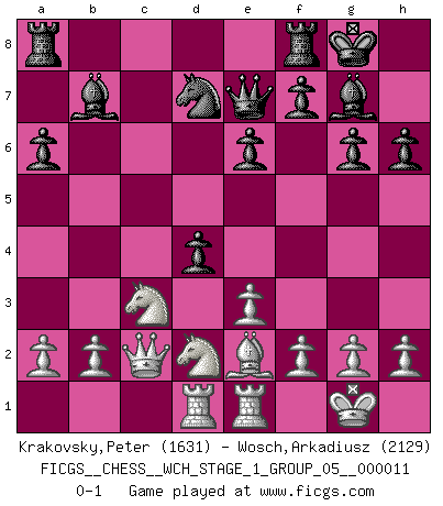 Last move : 0-1 2013 January 9 12:0:41 [Event "FICGS__CHESS__WCH_STAGE_1_GROUP_05__000011"] [Site "FICGS"] [Date "2012.11.01"] [Round "1"] [White "Krakovsky,Peter"] [Black "Wosch,Arkadiusz"] [Result "0-1"] [WhiteElo "1631"] [BlackElo "2129"] 1.c4 Nf6 2.d4 e6 3.Nf3 d5 4.Nc3 c6 5.Bg5 h6 6.Bxf6 Qxf6 7.e3 Nd7 8.Qc2 g6 9.Bd3 Bg7 10.O-O O-O 11.Rad1 Qe7 12.Rfe1 dxc4 13.Bxc4 b5 14.Be2 Bb7 15.Nd2 c5 16.Nxb5 a6 17.Nc3 cxd4 0-1 This chess game has been lost on time (started : 2012.11.01 17:13:40) English, 1...Nf6 (Anglo-Indian defense) Kingside Castling by player White (move 10) Kingside Castling by player Black (move 10) Player Black won this chess game. Follow this game move after move (download)Many have become Chess Masters, no one has become the Master of Chess. (Siegbert Tarrasch) Stelle das Brett so, daß die Sonne in die Augen deines Gegners scheint. (Ruy López) El Ajedrez hace al hombre ser mas sabio y ver mas claro. (Vladimir Putin) Des points faibles ou des trous dans la position de l'adversaire doivent être occupés par des pièces et non pas par des pions. (Siegbert Tarrasch) All politicians must be presumed guilty until they are proven innocent. (Dinesh De Silva)