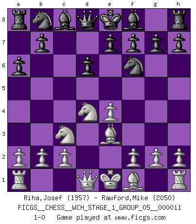 Last move : 1-0 2012 December 7 11:33:57 [Event "FICGS__CHESS__WCH_STAGE_1_GROUP_05__000011"] [Site "FICGS"] [Date "2012.11.01"] [Round "1"] [White "Riha,Josef"] [Black "Rawford,Mike"] [Result "1-0"] [WhiteElo "1957"] [BlackElo "2050"] 1.e4 c5 2.Nf3 d6 3.d4 cxd4 4.Nxd4 Nf6 5.Nc3 a6 6.Be3 1-0 This chess game has been lost on time (started : 2012.11.01 17:13:40) Sicilian : Najdorf, Byrne (English) attack Player White won this chess game. Follow this game move after move (download)What is the object of playing a gambit opening?... To acquire a reputation of being a dashing player at the cost of losing a game. (Siegbert Tarrasch) Wenn Schach ein enormer Dschungel ist, der seine Myriaden von Geheimnissen nicht preisgeben will, dann sind Computer die Kettensägen einer gewaltigen ökologisch unsensiblen Nutzholzfirma. (Nigel Short) Los Peones son nacidos libres, y aún así, se encuentran encadenados por todos lados. (Rick Kennedy) Les Echecs représentent une sphère d'idées créatrices basée sur la volonté des deux protagonistes. (Smyslov) Big Chess is a place for big hallucinations. (Thibault de Vassal)