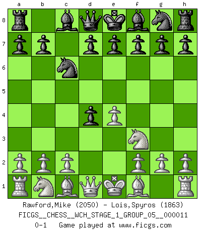 Last move : 0-1 2012 December 22 10:50:8 [Event "FICGS__CHESS__WCH_STAGE_1_GROUP_05__000011"] [Site "FICGS"] [Date "2012.11.01"] [Round "1"] [White "Rawford,Mike"] [Black "Lois,Spyros"] [Result "0-1"] [WhiteElo "2050"] [BlackElo "1863"] 1.e4 c5 2.Nf3 Nc6 3.d4 cxd4 0-1 This chess game has been lost on time (started : 2012.11.01 17:13:40) Sicilian defense Player Black won this chess game. Follow this game move after move (download)There is only one thing Fischer does in Chess without pleasure: to lose ! (Boris Spassky) Ihnen, Herr Lasker, habe ich nur drei Worte zu sagen: Schach und matt. (Siegbert Tarrasch) Si un gobernante no entiende al Ajedrez, ¿como puede governar él un reinado?. (El Rey Khusros II) Même un GMI sait rarement calculer sur plus de cinq coups une attaque à sacrifices. (Rudolf Spielmann) The only thing that overcomes hard luck is hard work. (Harry Golden)