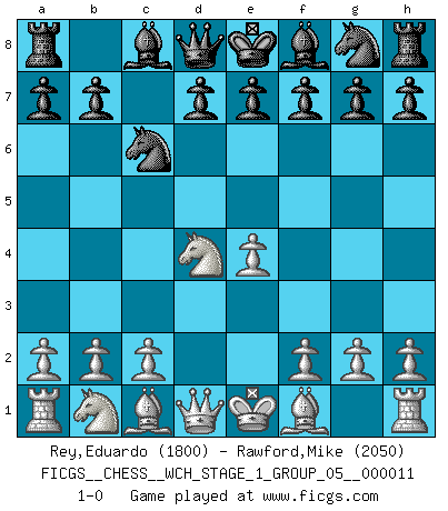 Last move : 1-0 2013 January 12 12:15:2 [Event "FICGS__CHESS__WCH_STAGE_1_GROUP_05__000011"] [Site "FICGS"] [Date "2012.12.01"] [Round "1"] [White "Rey,Eduardo"] [Black "Rawford,Mike"] [Result "1-0"] [WhiteElo "1800"] [BlackElo "2050"] 1.e4 c5 2.Nf3 Nc6 3.d4 cxd4 4.Nxd4 1-0 This chess game has been lost on time (started : 2012.12.01 0:43:1) Sicilian defense Player White won this chess game. Follow this game move after move (download)Chess is not like life... it has rules ! (Mark Pasternak) Capablanka war das größte Genie der Schachgeschichte! Aber denken sie nicht er habe nichts vom Schach verstanden. Er wusste nur soviel wie er wissen musste um seine Ziele zu erreichen. (Mikhail Moiseyevich Botvinik) Hay dos clases de hombres: aquellos que se conforman en dejarse llevar por las circunstancias y que juegan barajas y aquellos decididos a controlar las circunstancias y que juegan al Ajedrez. (Mortimer Collins) Psychologiquement, tu dois avoir confiance en toi même, mais cette confiance doit être basée sur des faits. (Robert Fischer) Ah, beer! The cause of, and the solution to, all of life's problems. (Homer Simpson)