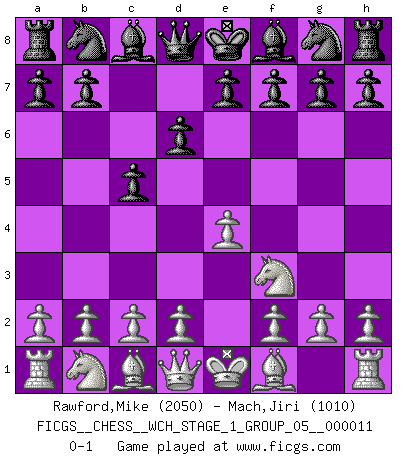 Last move : 0-1 2012 December 23 10:52:12 [Event "FICGS__CHESS__WCH_STAGE_1_GROUP_05__000011"] [Site "FICGS"] [Date "2012.11.01"] [Round "1"] [White "Rawford,Mike"] [Black "Mach,Jiri"] [Result "0-1"] [WhiteElo "2050"] [BlackElo "1010"] 1.e4 c5 2.Nf3 d6 0-1 This chess game has been lost on time (started : 2012.11.01 17:13:40) Sicilian Player Black won this chess game. Follow this game move after move (download)All my games are real. (Bobby Fischer) Korrekt heißt in Deutschland die Haltung eines Mannes, dessen Benehmen nach dem Urteile seiner Nachbarn seiner Stellung angemessen ist. Um korrekt zu sein, muß man sich der Meinung der anderen anpassen... (Emanuel Lasker) Un Peón pasado es un criminal, quién debe ser mantenido bajo candado y llave. Leves medidas, tales como vigilancia policiaca, no son suficientes. (Aaron Nimzovich) Les échecs, c'est l'imagination. (David Bronstein) Computers have lots of memory but no imagination. (Anonymous)