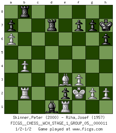 Last move : 1/2-1/2 2012 December 29 10:2:47 [Event "FICGS__CHESS__WCH_STAGE_1_GROUP_05__000011"] [Site "FICGS"] [Date "2012.11.01"] [Round "1"] [White "Skinner,Peter"] [Black "Riha,Josef"] [Result "1/2-1/2"] [WhiteElo "2000"] [BlackElo "1957"] 1.d4 Nf6 2.c4 e6 3.Nc3 Bb4 4.Qc2 O-O 5.a3 Bxc3+ 6.Qxc3 b6 7.Bg5 Bb7 8.Nh3 h6 9.Bh4 d5 10.cxd5 exd5 11.e3 c5 12.Bd3 Nc6 13.dxc5 d4 14.Qc2 Ne5 15.O-O bxc5 16.Rfd1 Nxd3 17.Qxd3 dxe3 18.Qf5 Qc8 19.Qxc8 Bxc8 20.Bxf6 Bxh3 21.Be7 Rfe8 22.Bxc5 e2 23.Re1 Bf5 24.f3 Bc2 25.b4 Bd1 26.Kf2 Red8 27.a4 Rd7 28.a5 Rb8 29.a6 Kh7 30.Ra5 Re8 31.Ra2 Rc8 32.Be3 Rb8 33.Rb2 1/2-1/2 Nimzo-Indian : Classical variation Kingside Castling by player Black (move 4) Kingside Castling by player White (move 15) This chess game ended in a draw. Follow this game move after move (download)The sign of a great Master is his ability to win a won game quickly and painlessly. (Irving Chernev) Schach ist mein Leben, meine Leidenschaft, was ich gelernt habe und seit meinem 14. Lebensjahr profimässig praktiziere. Darauf zu verzichten, würde mir sehr schwer fallen. (Viktor Kortschnoi) Cuando tu no sabes absolutamente que mas hacer, es tiempo de entrar en pánico. (John van der Wiel) En blitz, le Cavalier l'emporte sur le Fou. (Vlastimil Hort) To steal ideas from one person is plagiarism. To steal from many is research. (Unknown)