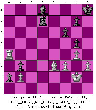 Last move : 0-1 2013 February 10 15:30:14 [Event "FICGS__CHESS__WCH_STAGE_1_GROUP_05__000011"] [Site "FICGS"] [Date "2012.11.01"] [Round "1"] [White "Lois,Spyros"] [Black "Skinner,Peter"] [Result "0-1"] [WhiteElo "1863"] [BlackElo "2000"] 1.e4 e5 2.Nf3 Nf6 3.Nxe5 d6 4.Nf3 Nxe4 5.d4 d5 6.Bd3 Nc6 7.O-O Be7 8.c4 Nb4 9.cxd5 Nxd3 10.Qxd3 Qxd5 11.Re1 Bf5 12.g4 Bg6 13.Nc3 Nxc3 14.Qxc3 f6 15.Nh4 Kf7 16.Qxc7 Rhe8 17.Nxg6 hxg6 18.Bf4 Rad8 19.Rad1 Rd7 20.Qc2 Qxa2 21.Re4 Red8 22.Bg3 b5 23.Kg2 a5 24.Qd3 Qd5 25.f3 Rc8 26.Rd2 b4 27.Rde2 Bf8 28.Qe3 a4 29.Re8 Rxe8 30.Qxe8+ Kg8 31.Be1 g5 32.h3 b3 33.Bc3 Rd8 34.Qe3 Rc8 35.Rd2 Qc4 36.d5 a3 37.Qe6+ Kh8 38.Rd4 Qc5 39.d6 a2 40.Ra4 Rb8 41.d7 Qe7 42.Qxe7 Bxe7 43.Bd4 Rb7 44.d8Q+ Bxd8 45.Be3 Rd7 0-1 Petrov : Classical attack Kingside Castling by player White (move 7) Promotion Queen by player White (move 44) Player Black won this chess game. Follow this game move after move (download)I give 98 percent of my mental energy to Chess. Others give only 2 percent. (Bobby Fischer) Dein Körper muss in Topform sein. Dein Schach verfällt, wenn dein Körper verfällt. Der Körper kann nicht vom Geist getrennt werden. (Robert James Fischer) El Jaque al descubierto es el bombardero del tablero. (Reuben Fine) Je ne suis pas le dernier à jouer lâchement des coups douteux pendant le zeïtnot de l'adversaire pour l'achever: en effet les coups qui font le plus peur sont ceux que l'on ne comprend pas. Je me fais souvent peur quand je joue. (Un professeur anonyme) Life is like a game of cards: the hand you are dealt represents determinism; the way you play it is free will. (Jawaharlal Nehru)