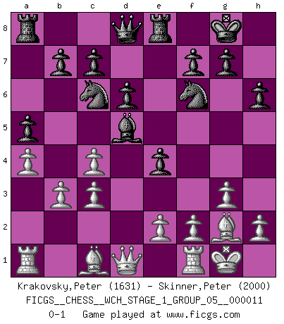 Last move : 0-1 2013 January 7 11:45:36 [Event "FICGS__CHESS__WCH_STAGE_1_GROUP_05__000011"] [Site "FICGS"] [Date "2012.11.01"] [Round "1"] [White "Krakovsky,Peter"] [Black "Skinner,Peter"] [Result "0-1"] [WhiteElo "1631"] [BlackElo "2000"] 1.c4 e5 2.Nc3 Nf6 3.g3 Bb4 4.Bg2 O-O 5.Nf3 Re8 6.O-O e4 7.Nd4 Nc6 8.Nc2 Bxc3 9.dxc3 d6 10.Ne3 Be6 11.Nd5 h6 12.b3 a5 13.a4 Bxd5 0-1 This chess game has been lost on time (started : 2012.11.01 17:13:40) English : Bremen, Smyslov system Kingside Castling by player Black (move 4) Kingside Castling by player White (move 6) Player Black won this chess game. Follow this game move after move (download)All that matters on the Chessboard is good moves. (Bobby Fischer) Das Schach hält seine Meister in eigenen Banden, Fesseln; auf vielerlei Weise formt es ihren Geist, so dass die innere Freiheit selbst des Stärksten beeinflusst wird. (Albert Einstein) Solo puedes ser bueno en el Ajedrez si amas al juego. (Bobby Fischer) Horreur, mais aussi harmonie suprême : qu'y avait-il en effet au monde en dehors des échecs ? Le brouillard, l'inconnu, le non-être... (Vladimir Nabokov) The human is the only animal species whose members are able to talk themselves into difficulties that would not otherwise exist. (Wendell Johnson)