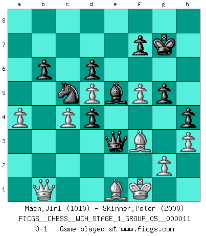 Last move : 0-1 2013 April 27 18:18:10 [Event "FICGS__CHESS__WCH_STAGE_1_GROUP_05__000011"] [Site "FICGS"] [Date "2012.11.01"] [Round "1"] [White "Mach,Jiri"] [Black "Skinner,Peter"] [Result "0-1"] [WhiteElo "1010"] [BlackElo "2000"] 1.e4 c5 2.Nf3 d6 3.d4 cxd4 4.Nxd4 Nf6 5.Nc3 a6 6.Be3 e5 7.Nb3 Be6 8.f3 h5 9.Be2 Nbd7 10.Nd5 Bxd5 11.exd5 g6 12.Qd2 Bg7 13.O-O O-O 14.c4 a5 15.a4 Re8 16.Rae1 b6 17.Bg5 Qc7 18.Bd3 Nh7 19.Bh4 Bf6 20.Bf2 Nc5 21.Qc2 Nxa4 22.Nd4 exd4 23.Qxa4 Rxe1 24.Rxe1 Nf8 25.Qc2 Rc8 26.Qb1 Kg7 27.b3 Qc5 28.h3 Nd7 29.f4 h4 30.Rf1 Re8 31.Qd1 Qb4 32.Bc2 Qc3 33.f5 g5 34.Re1 Rxe1+ 35.Bxe1 Qb2 36.Qb1 Qa3 37.Bd1 Nc5 38.Kf1 a4 39.bxa4 Qe3 40.Bf3 Be5 0-1 Sicilian : Najdorf, Byrne (English) attack Kingside Castling by player White (move 13) Kingside Castling by player Black (move 13) Player Black won this chess game. Follow this game move after move (download)War is the child of passion, passion is the child of narcissism and narcissism is the child. (...) Another game ? (Thibault de Vassal) Obwohl ich alt bin, darf mir niemand den Finger in den Mund stecken, sonst beisse ich. (Wilhelm Steinitz) Bendita sea la memoria de aquel que dio al mundo este juego inmortal. (A. G. Gardiner) J'apprécie les joueurs d'est-indienne, c'est grâce à eux que je nourris ma famille depuis tant d'années. (Petrosian) He who defends everything defends nothing. (Frederick the Great)