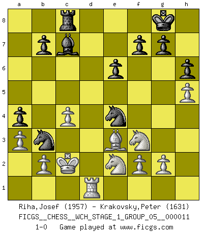 Last move : 1-0 2013 January 12 12:15:2 [Event "FICGS__CHESS__WCH_STAGE_1_GROUP_05__000011"] [Site "FICGS"] [Date "2012.11.01"] [Round "1"] [White "Riha,Josef"] [Black "Krakovsky,Peter"] [Result "1-0"] [WhiteElo "1957"] [BlackElo "1631"] 1.e4 c6 2.d4 d5 3.Nd2 dxe4 4.Nxe4 Bf5 5.Ng3 Bg6 6.h4 h6 7.Nf3 Nd7 8.h5 Bh7 9.Bd3 Bxd3 10.Qxd3 Ngf6 11.Bd2 e6 12.O-O-O Be7 13.Qe2 O-O 14.Ne5 c5 15.dxc5 Nxc5 16.Be3 Qc7 17.Bd4 Rfd8 18.Kb1 a5 19.Ng4 Nd5 20.c4 Nb4 21.Qe5 Qxe5 22.Nxe5 a4 23.Ne2 Rac8 24.a3 Nba6 25.Be3 Bd6 26.Nf3 Ne4 27.Rd4 Nac5 28.Rhd1 Bc7 29.Rxd8+ Bxd8 30.Ne5 Bc7 31.Nf3 Nb3 32.Kc2 1-0 This chess game has been lost on time (started : 2012.11.01 17:13:40) Caro-Kann : 3.Nd2 Queenside Castling by player White (move 12) Kingside Castling by player Black (move 13) Player White won this chess game. Follow this game move after move (download)I played Chess with him and would have beaten him sometimes only he always took back his last move, and ran the game out differently. (Mark Twain) Wenn ich gewinne bin ich ein Genie. Wenn nicht, dann bin ich keines. (Robert James Fischer) ¿Se han dado cuenta de que Fischer casi nunca ha tenido piezas malas? El las intercambia y las piezas malas se quedan con sus oponenets. (Yuri Balashov) La conception d'un plan est le processus par lequel un joueur exploite les avantages de sa position tout en s'efforçant d'en réduire au minimum les inconvénients. Afin de garantir le succès, un plan doit toujours se fonder sur un diagnostic objectif des particularités d'une position. La conception d'un plan est d'autant plus difficile que la position est équilibrée, et grandement facilitée lorsqu'il n'existe qu'un seul plan susceptible de répondre aux exigences de la position. (Harry Golombek) There are two major products that came out of Berkeley: LSD and UNIX. We do not believe this is to be a coincidence. (Jeremy S. Anderson)