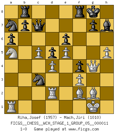 Last move : 1-0 2013 March 25 16:24:21 [Event "FICGS__CHESS__WCH_STAGE_1_GROUP_05__000011"] [Site "FICGS"] [Date "2012.11.01"] [Round "1"] [White "Riha,Josef"] [Black "Mach,Jiri"] [Result "1-0"] [WhiteElo "1957"] [BlackElo "1010"] 1.e4 c6 2.d4 d5 3.e5 Bf5 4.Nf3 e6 5.Be2 c5 6.O-O Nc6 7.c3 cxd4 8.cxd4 Nge7 9.a3 Nc8 10.b4 Be7 11.Be3 Nb6 12.Nbd2 O-O 13.Rc1 Rc8 14.Re1 a6 15.h3 h6 16.Rf1 Qd7 17.Nb3 Nc4 18.Nc5 Bxc5 19.bxc5 Nxa3 20.Qa4 Nb5 21.Nd2 Rfd8 22.Rfd1 Rb8 23.Nb3 Ne7 24.Qa2 Be4 25.Qb2 Rbc8 26.Ra1 Bh7 27.Ra5 Nc6 28.Ra4 Qc7 29.Rda1 Rb8 30.Na5 Nca7 31.Kh1 Be4 32.R4a2 Rf8 33.Rc1 Qd7 34.f3 Bg6 35.Rca1 Bh7 36.Bf2 Rfc8 37.Kg1 Qe7 38.Qd2 Qc7 39.Bf1 Rf8 40.h4 Bg6 41.g4 Bh7 42.h5 f6 43.Bg2 f5 44.g5 hxg5 45.Qxg5 f4 46.Rd2 Nc3 47.Qg4 1-0 Caro-Kann : Advance variation Kingside Castling by player White (move 6) Kingside Castling by player Black (move 12) Player White won this chess game. Follow this game move after move (download)Help your pieces so they can help you. (Paul Morphy) Es ist wirklich schade, dass so viele Schachspieler nicht auf ihr Äußeres achten! (Alexandra Kosteniuk) Si un gobernante no entiende al Ajedrez, ¿como puede governar él un reinado?. (El Rey Khusros II) D'abord les bases : Jouez et étudiez, puis étudiez et jouez, ensuite jouez et étudiez, puis étudiez et jouez. Deuxièmement : Donnez toujours le meilleur de vous-même ! (Ken Smith) Home computers are being called upon to perform many new functions, including the consumption of homework formerly eaten by the dog. (Doug Larson)