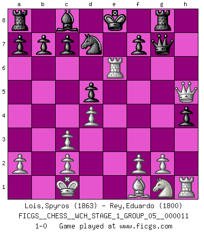 Last move : 1-0 2012 December 13 15:30:18 [Event "FICGS__CHESS__WCH_STAGE_1_GROUP_05__000011"] [Site "FICGS"] [Date "2012.12.01"] [Round "1"] [White "Lois,Spyros"] [Black "Rey,Eduardo"] [Result "1-0"] [WhiteElo "1863"] [BlackElo "1800"] 1.e4 e6 2.d4 d5 3.Nc3 Nf6 4.Bg5 Bb4 5.e5 h6 6.exf6 hxg5 7.fxg7 Rg8 8.h4 Bxc3+ 9.bxc3 gxh4 10.Qh5 Qf6 11.O-O-O Qxg7 12.Re1 Nd7 13.Rxe6+ 1-0 French : MacCutcheon, Chigorin variation Queenside Castling by player White (move 11) Player White won this chess game. Follow this game move after move (download)Capture of the adverse King is the ultimate but not the first object of the game. (William Steinitz) Die Fehler sind da, Sie warten nur darauf gemacht zu werden. (Savielly Grigorievitsch Tartakower) No puedes jugar al Ajedrez si eres de corazón noble. (Proverbio Francés) Les Echecs sont affaire de jugement sensible. Savoir quand frapper et quand esquiver. (Fischer) If only people were all showed a certain minimum level of niceness; if only people didn't retract verbal draw offers (without draw box ticked) on ficgs; if only people didn't kill; if only people didn't run concentration / extermination camps, if only people didn't drop nuclear bombs on Hiroshima and Nagasaki, and so on - it would be a much more beautiful world. But sadly, things are not so... (Normajean Yates)