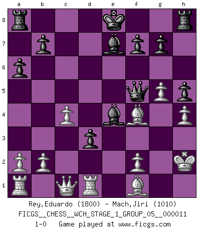 Last move : 1-0 2013 March 25 6:51:13 [Event "FICGS__CHESS__WCH_STAGE_1_GROUP_05__000011"] [Site "FICGS"] [Date "2012.12.01"] [Round "1"] [White "Rey,Eduardo"] [Black "Mach,Jiri"] [Result "1-0"] [WhiteElo "1800"] [BlackElo "1010"] 1.e4 c5 2.Nf3 d6 3.d4 cxd4 4.Nxd4 Nf6 5.Nc3 a6 6.Be2 e5 7.Nb3 Be7 8.Be3 Be6 9.g4 d5 10.exd5 Nxd5 11.Nxd5 Bxd5 12.O-O Nc6 13.c4 Be4 14.Qe1 Bb4 15.Qc1 h5 16.g5 Be7 17.h4 Qd7 18.Kh2 Nd4 19.Nxd4 exd4 20.Bf4 d3 21.Rd1 Qf5 22.Bf1 1-0 This chess game has been lost on time (started : 2012.12.01 0:43:1) Sicilian : Najdorf, Opovcensky variation Kingside Castling by player White (move 12) Player White won this chess game. Follow this game move after move (download)Tactics flow from a superior position. (Bobby Fischer) Immer nach dem besten Zug zu suchen ist ziemlich unpraktisch. (Nigel Short) El Ajedrez es un invernadero donde los frutos del carácter pueden madurar mas completamente que en la vida. (Edward Morgan Foster) Même si l'adversaire joue le coup analysé précédemment, recommencez l'analyse en voyant la nouvelle position. Première règle de Blumenfeld Programmer - an organism that turns coffee into software. (Anonymous)