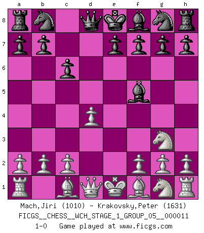 Last move : 1-0 2013 January 7 11:45:36 [Event "FICGS__CHESS__WCH_STAGE_1_GROUP_05__000011"] [Site "FICGS"] [Date "2012.11.01"] [Round "1"] [White "Mach,Jiri"] [Black "Krakovsky,Peter"] [Result "1-0"] [WhiteElo "1010"] [BlackElo "1631"] 1.e4 c6 2.d4 d5 3.Nc3 dxe4 4.Nxe4 Bf5 5.Ng3 1-0 This chess game has been lost on time (started : 2012.11.01 17:13:40) Caro-Kann : Classical variation Player White won this chess game. Follow this game move after move (download)If your opponent offers you a draw, try to work out why he thinks he's worse off. (Nigel Short) Nach Morphy wurde nichts neues mehr in der Behandlung offener Positionen gefunden. (Mikhail Moiseyevich Botvinik) Me siento como si fuera una pieza en una partida de Ajedrez, cuando mi oponente me indica: esa pieza no puede ser movida. (Soren Kierkegaard) A chaque perte on perd un peu de soi. (Joël Lautier) I have opinions of my own - strong opinions - but I don't always agree with them. (George Bush)
