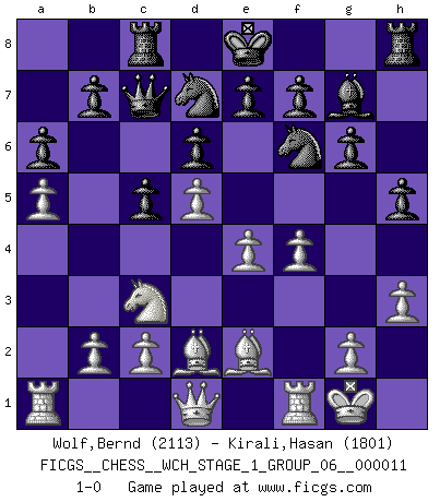 Last move : 1-0 2013 March 4 5:1:7 [Event "FICGS__CHESS__WCH_STAGE_1_GROUP_06__000011"] [Site "FICGS"] [Date "2012.12.01"] [Round "1"] [White "Wolf,Bernd"] [Black "Kirali,Hasan"] [Result "1-0"] [WhiteElo "2113"] [BlackElo "1801"] 1.e4 Nc6 2.Nf3 d6 3.d4 Nf6 4.Nc3 a6 5.Bf4 Bg4 6.d5 Ne5 7.Be2 Bxf3 8.Bxf3 g6 9.Be2 Rc8 10.Be3 c5 11.O-O Qa5 12.f4 Ned7 13.a4 Bg7 14.Bd2 Qc7 15.a5 h5 16.h3 1-0 This chess game has been lost on time (started : 2012.12.01 0:41:9) KP : Nimzovich defense Kingside Castling by player White (move 11) Player White won this chess game. Follow this game move after move (download)A good sacrifice is one that is not necessarily sound but leaves your opponent dazed and confused. (Rudolph Spielmann) Ihnen, Herr Lasker, habe ich nur drei Worte zu sagen: Schach und matt. (Siegbert Tarrasch) Coloca el contenido del tablero de Ajedrez en un sombrero, agita las piezas vigorosamente, derrámalas en el tablero desde una altura de medio metro y así obtienes el estilo de Wilhelm Steinitz. (H. E. Bird) J'apprécie les joueurs d'est-indienne, c'est grâce à eux que je nourris ma famille depuis tant d'années. (Petrosian) Luck is the residue of design. (John Milton)