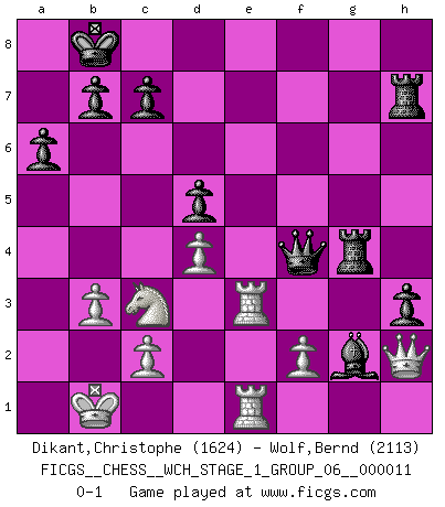 Last move : 0-1 2013 April 3 21:59:27 [Event "FICGS__CHESS__WCH_STAGE_1_GROUP_06__000011"] [Site "FICGS"] [Date "2012.12.01"] [Round "1"] [White "Dikant,Christophe"] [Black "Wolf,Bernd"] [Result "0-1"] [WhiteElo "1624"] [BlackElo "2113"] 1.d4 f5 2.Nc3 Nf6 3.Bg5 d5 4.Bxf6 exf6 5.e3 Be6 6.Bd3 Nc6 7.a3 a6 8.Qf3 Qd7 9.h3 h5 10.O-O-O O-O-O 11.Nge2 Kb8 12.Nf4 Bf7 13.Nfe2 Ne7 14.Kb1 h4 15.g4 fxg4 16.hxg4 Nc8 17.Bf5 Qc6 18.g5 Nd6 19.gxf6 gxf6 20.Bd3 f5 21.Bxf5 Nc4 22.Bd3 Bh5 23.Qf5 Bxa3 24.Bxc4 Qxc4 25.b3 Qc6 26.Qd3 Bf3 27.Rh3 Rdf8 28.Rg1 Qd7 29.Rh2 Bd6 30.Nf4 Bxf4 31.exf4 Rxf4 32.Qe3 Rg4 33.Re1 Qf7 34.Qe5 Rh7 35.Rh3 Bg2 36.Rhe3 h3 37.Qh2 Qf4 0-1 Dutch Queenside Castling by player White (move 10) Queenside Castling by player Black (move 10) Player Black won this chess game. Follow this game move after move (download)Let the perfectionist play postal. (Yasser Seirawan) Der Freibauer hat für mich eine Seele, genau wie der Mensch, Wünsche, die unerkannt in ihm schlummern, und Befürchtungen, von deren Existenz er selbst kaum ahnt. (Aaron Nimzowitsch) El jugador táctico debe saber que hacer cuando algo se debe de hacer. El estratégico debe saber que hacer cuando nada se debe de hacer. (Savielly Tartakover) On est toujours la mazette de quelqu'un d'autre. (Anonyme) Wipe them out. All of them. (Darth Sidious in Star Wars ep.1)