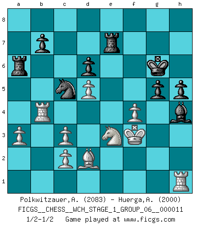 Last move : 1/2-1/2 2013 January 29 16:25:0 [Event "FICGS__CHESS__WCH_STAGE_1_GROUP_06__000011"] [Site "FICGS"] [Date "2012.11.01"] [Round "1"] [White "Polkwitzauer,Ardiantez"] [Black "Huerga,Aser"] [Result "1/2-1/2"] [WhiteElo "2083"] [BlackElo "2000"] 1.e4 c5 2.Nf3 Nc6 3.d4 cxd4 4.Nxd4 Nf6 5.Nc3 e5 6.Ndb5 d6 7.Bg5 a6 8.Na3 Rb8 9.Nd5 Qa5+ 10.Bd2 Qd8 11.Bd3 Nxd5 12.exd5 Ne7 13.Qf3 f5 14.Be2 Qc7 15.O-O Ng6 16.Qc3 Qxc3 17.bxc3 Kf7 18.Rfb1 Be7 19.Rb3 Nf8 20.Bxa6 Nd7 21.Be2 Nc5 22.Rb6 f4 23.Nc4 Rd8 24.Rb2 Ra8 25.f3 Bf5 26.Be1 Kf8 27.a3 Bf6 28.Nb6 Ra5 29.g3 e4 30.fxe4 Re8 31.exf5 Rxe2 32.gxf4 Ra6 33.h4 h5 34.Kf1 Re4 35.Bd2 Bxh4 36.Rb4 Kf7 37.Rab1 Kf6 38.Nc4 Kxf5 39.Ne3+ Kf6 40.Ke2 g5 41.Rh1 Kg6 42.Kf3 Re7 1/2-1/2 Sicilian : Pelikan (Lasker/Sveshnikov) variation Kingside Castling by player White (move 15) This chess game ended in a draw. Follow this game move after move (download)In blitz, the Knight is stronger than the Bishop. (Vlastimil Hort) Wer sich die Fähigkeit anerziehen will im Schach selbstständig zu denken, der muß alles meiden, was leblos ist: ausgeklügelte Theorien, die sich auf sehr wenige Beispiele und eine Menge Hirngespinste stützen. (Emanuel Lasker) El Ajedrez detiene a su maestro dentro de sus propios vínculos, encadenando la mente y el cerebro, por lo que la libertad interior del mas fuerte debe sufrir. (Albert Einstein) Il s'avisa de me proposer d'apprendre les échecs qu'il jouait un peu... me voilà forcené des échecs. J'achète un échiquier, je m'enferme dans ma chambre, j'y passe des jours et des nuits à vouloir apprendre par cur toutes les parties. (Jean-Jacques Rousseau, Confessions) In fact if nothing is done against this teddy bear, hereby I announce that I would quit chess, rapid chess, blitz chess, postal chess, email chess, server chess and correspondence chess I will then switch to a table game where teddy bears aren't going to be seen for a while, like Poker, or Roulette, all 18+ games. (Elmer Valderrama)