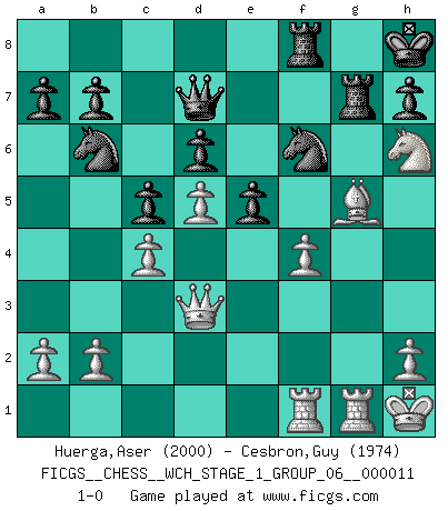 Last move : 1-0 2013 January 5 21:9:58 [Event "FICGS__CHESS__WCH_STAGE_1_GROUP_06__000011"] [Site "FICGS"] [Date "2012.11.01"] [Round "1"] [White "Huerga,Aser"] [Black "Cesbron,Guy"] [Result "1-0"] [WhiteElo "2000"] [BlackElo "1974"] 1.d4 g6 2.c4 Bg7 3.Nc3 d6 4.e4 Nf6 5.Nf3 O-O 6.Be2 Nbd7 7.O-O e5 8.Be3 c6 9.d5 c5 10.Ne1 Ne8 11.g4 f5 12.exf5 gxf5 13.gxf5 Nb6 14.Kh1 Bxf5 15.Rg1 Kh8 16.Ng2 Qe7 17.Qd2 Rg8 18.f3 Bf6 19.Ne4 Qf7 20.Raf1 Be7 21.Ng5 Bxg5 22.Bxg5 Nf6 23.Qe3 Rae8 24.Nh4 Bg6 25.Bd3 Bxd3 26.Qxd3 Ref8 27.Nf5 Qd7 28.Nh6 Rg7 29.f4 1-0 Modern defense Kingside Castling by player Black (move 5) Kingside Castling by player White (move 7) Player White won this chess game. Follow this game move after move (download)In order to improve your game, you must study the endgame before everything else, for whereas the endings can be studied and mastered by themselves, the middle game and the opening must be studied in relation to the endgame. (Jose Raul Capablanca) Wenn es im Universum noch irgendwo intelligente Lebewesen gibt, dann kennen sie Go. (Emanuel Lasker) Bobby Fischer es el mas grande genio de Ajedrez de todos los tiempos. (Alexander Kotov) Il (Jacob Murray) ne joue pas pour le bon coup, mais pour le meilleur. (Eloi Relange) Being number two sucks. (Andre Agassi)