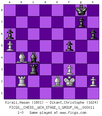 Last move : 1-0 2013 January 25 17:47:20 [Event "FICGS__CHESS__WCH_STAGE_1_GROUP_06__000011"] [Site "FICGS"] [Date "2012.11.01"] [Round "1"] [White "Kirali,Hasan"] [Black "Dikant,Christophe"] [Result "1-0"] [WhiteElo "1801"] [BlackElo "1624"] 1.e4 d6 2.d4 Nf6 3.Nc3 e5 4.dxe5 dxe5 5.Qxd8+ Kxd8 6.Bg5 Bd6 7.Rd1 Nbd7 8.Nb5 Ke7 9.Nxd6 cxd6 10.f3 h6 11.Be3 Nc5 12.Ne2 Be6 13.Kf2 Rhc8 14.Nc3 a6 15.a4 Bd7 16.Ra1 Be6 17.a5 d5 18.exd5 Nxd5 19.Nxd5+ Bxd5 20.b3 f5 21.Rd1 Be6 22.Bc1 e4 23.Ba3 Kf7 24.Rd6 Nxb3 25.cxb3 Rc2+ 26.Be2 exf3 27.gxf3 Bxb3 28.Rc1 Rac8 29.Rd7+ Kg8 30.Rxc2 Rxc2 31.Rxb7 Bc4 32.Rb2 Rc3 33.Bb4 1-0 Pirc defense Player White won this chess game. Follow this game move after move (download)I believe that Chess possesses a magic that is also a help in advanced age. A rheumatic knee is forgotten during a game of Chess and other events can seem quite unimportant in comparison with a catastrophe on the chessboard. (Vlastimil Hort) Früher wurde jeder komplizierte Zug, jedes interessante Opfer mit großem Beifall und Enthusiasmus aufgenommen. Heute schaltet man einfach seinen Fritz an, und man kann sehen, was los ist, ob der Zug geht oder nicht. (Vladimir Kramnik) El muchacho (en ese entonces un niño de 12 años llamado Anatoly Karpov) no tiene ni idea de lo que es el Ajedrez y no hay futuro en absoluto para el en esta profesión. (Mikhail Botvinnik) Les Echecs sont et restent toujours un combat, un combat intégral comme la boxe, la lutte ou un autre sport, et où il doit y avoir un vainqueur et un vaincu. (Joseph Emil Diemer) A clear conscience is usually the sign of a bad memory. (Unknown)