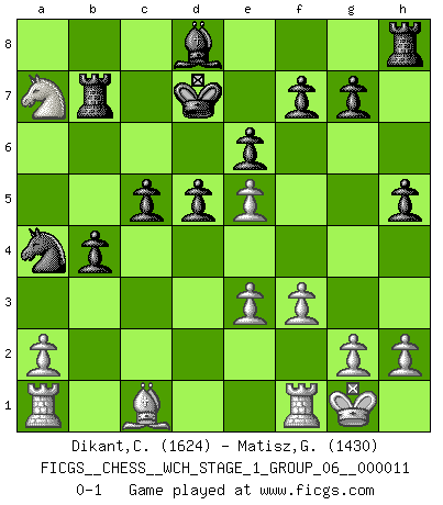 Last move : 0-1 2013 January 2 21:3:14 [Event "FICGS__CHESS__WCH_STAGE_1_GROUP_06__000011"] [Site "FICGS"] [Date "2012.11.01"] [Round "1"] [White "Dikant,Christophe"] [Black "Matisz,Gergely"] [Result "0-1"] [WhiteElo "1624"] [BlackElo "1430"] 1.d4 h5 2.Nf3 Nf6 3.e3 a6 4.c4 e6 5.Nc3 d5 6.c5 b6 7.b4 a5 8.Qa4+ Bd7 9.Bb5 Bxb5 10.Qxb5+ c6 11.Qa4 Nbd7 12.Qxc6 axb4 13.Nb5 Rc8 14.Qb7 bxc5 15.O-O Be7 16.Ne5 Nxe5 17.dxe5 Rb8 18.Qc6+ Qd7 19.Na7 Ne4 20.f3 Nc3 21.Bb2 Na4 22.Bc1 Rb7 23.Qc8+ Bd8 24.Qxd7+ Kxd7 0-1 Queen's pawn Kingside Castling by player White (move 15) Player Black won this chess game. Follow this game move after move (download)In Chess, at least, the brave inherit the earth. (Edmar Mednis) Man gibt nur Pakete auf. (Paul Keres) Una buena ofensiva y una buena defensa, comienzan ambas con un buen desarrollo. (Bruce A. Moon) Le génie consiste à savoir transgresser les règles au moment opportun. (Teichmann) The next best thing to gambling and winning is gambling and loosing. (Nick Dandalos)