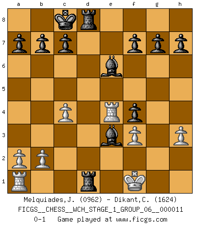 Last move : 0-1 2012 November 8 1:32:33 [Event "FICGS__CHESS__WCH_STAGE_1_GROUP_06__000011"] [Site "FICGS"] [Date "2012.11.01"] [Round "1"] [White "Melquiades,Jay"] [Black "Dikant,Christophe"] [Result "0-1"] [WhiteElo "0962"] [BlackElo "1624"] 1.e4 d5 2.d3 dxe4 3.dxe4 Qxd1+ 4.Kxd1 Nc6 5.c3 e5 6.h3 Be6 7.f4 O-O-O 8.Bd2 exf4 9.Nf3 Nf6 10.Bd3 Rxd3 11.c4 Nxe4 12.Re1 Nxd2 13.Nbxd2 Bb4 14.Re2 Rhd8 15.Ke1 Nd4 16.Re4 Nxf3+ 17.gxf3 Bxd2+ 18.Kf2 Be3+ 19.Kf1 Rd1+ 0-1 Scandinavian (centre counter) defense Queenside Castling by player Black (move 7) Player Black won this chess game. Follow this game move after move (download)Up to this point White has been following well-known analysis. But now he makes a fatal error: he begins to use his own head. (Siegbert Tarrasch) Wenn ein Kopf und ein Buch zusammenstoßen und es klingt hohl, ist es denn allemal im Buche? (Georg Christoph Lichtenberg) El Ajedrez es el arte del análisis. (Mikhail Botvinnik) On n'a jamais que l'âge auquel on a commence à jouer aux échecs car après on cesse de vieillir. (Capablanca) You must do what you feel is right... of course. (Obi-Wan Kenobi in Star Wars ep.4)