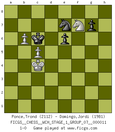 Last move : 1-0 2013 February 20 0:13:57 [Event "FICGS__CHESS__WCH_STAGE_1_GROUP_07__000011"] [Site "FICGS"] [Date "2012.11.01"] [Round "1"] [White "Ponce,Trond"] [Black "Domingo,Jordi"] [Result "1-0"] [WhiteElo "2112"] [BlackElo "1981"] 1.e4 h6 2.d4 c5 3.dxc5 e6 4.Be3 Na6 5.Nc3 Nxc5 6.Nf3 b6 7.b4 Na6 8.a3 Bb7 9.Bd3 Nc7 10.O-O Nf6 11.Qe2 Be7 12.e5 Nfd5 13.Nxd5 Nxd5 14.Bd2 Nc7 15.c4 d5 16.exd6 Bxd6 17.Rad1 O-O 18.Bb1 Qf6 19.Bxh6 Bxb4 20.Ne5 Qxh6 21.axb4 Rfd8 22.Be4 Bxe4 23.Qxe4 Qh5 24.g4 Qh4 25.Kg2 f6 26.Nc6 f5 27.Qf4 Rxd1 28.Rxd1 Qxg4+ 29.Qxg4 fxg4 30.Rd7 Ne8 31.Rxa7 Rxa7 32.Nxa7 Nf6 33.Kg3 Ne4+ 34.Kf4 Nxf2 35.Ke3 Nh1 36.Nc8 g3 37.hxg3 Nxg3 38.Nxb6 Kf7 39.c5 Ke7 40.Nc4 Nf5+ 41.Kd3 Kd8 42.Ne5 Kc8 43.Nf7 Ne7 44.b5 Kc7 45.b6+ Kc6 46.Kc4 1-0 Carr's defense Kingside Castling by player White (move 10) Kingside Castling by player Black (move 17) 10 pieces endgame at move 37 : White KNPPP , Black KNPPP WHITE : King + 1 Knight 3 Pawns BLACK : King + 1 Knight 3 Pawns 9 pieces endgame at move 37 : White KNPP , Black KNPPP WHITE : King + 1 Knight 2 Pawns BLACK : King + 1 Knight 3 Pawns 8 pieces endgame at move 38 : White KNPP , Black KNPP WHITE : King + 1 Knight 2 Pawns BLACK : King + 1 Knight 2 Pawns Player White won this chess game. Follow this game move after move (download)Chess is everything: art, science and sport. (Anatoly Karpov) Ich glaube nicht an Psychologie, ich glaube an gute Züge. (Robert James Fischer) A través de las casillas del tablero, los Indios explican el movimiento del tiempo y la edad, las influencias mas altas que controlan el mundo y los lazos que vinculan al Ajedrez con el alma humana. (Al-Masudi) J'ai vu le vaincu d'Echecs jouer des années durant dans l'espoir de la fête de la victoire. Car tu es plus riche de ce qu'elle existe si même elle n'est point pour toi. Ainsi de la perle du fond des mers. (Antoine de Saint-Exupéry) There are two major products that came out of Berkeley: LSD and UNIX. We do not believe this is to be a coincidence. (Jeremy S. Anderson)