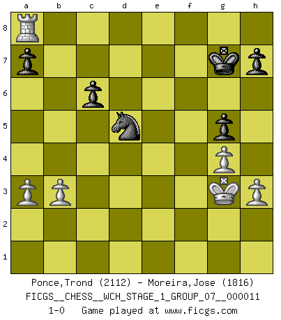 Last move : 1-0 2012 December 4 18:11:58 [Event "FICGS__CHESS__WCH_STAGE_1_GROUP_07__000011"] [Site "FICGS"] [Date "2012.11.01"] [Round "1"] [White "Ponce,Trond"] [Black "Moreira,Jose"] [Result "1-0"] [WhiteElo "2112"] [BlackElo "1816"] 1.e4 c5 2.Nf3 d6 3.d4 cxd4 4.Qxd4 Bd7 5.c4 Nc6 6.Qd2 g6 7.Be2 Bg7 8.O-O Nf6 9.Nc3 Bg4 10.Rb1 Nd7 11.b3 O-O 12.Rd1 Nc5 13.Qe3 Bxc3 14.Qxc3 Nxe4 15.Qe3 Nf6 16.Bb2 Qb6 17.Qf4 Bf5 18.Rbc1 Rae8 19.h3 Qa5 20.g4 Bc8 21.a3 Qd8 22.c5 e5 23.Qh6 d5 24.Ng5 Re7 25.f4 Rfe8 26.Rf1 d4 27.fxe5 Rxe5 28.Nxf7 Qc7 29.Nxe5 Qxe5 30.Bc4+ Nd5 31.Rc2 Be6 32.Re2 Ne3 33.Bxd4 Nxd4 34.Rxe3 Qxc5 35.Qf4 g5 36.Bxe6+ Rxe6 37.Qf7+ Kh8 38.Rc3 Ne2+ 39.Kg2 Qd5+ 40.R1f3 Nf4+ 41.Kg3 Rc6 42.Qxd5 Nxd5 43.Rxc6 bxc6 44.Rf8+ Kg7 45.Ra8 1-0 Comment by player 2 : Jose Moreira : Thanks for the game, congratulations Regards Trond Ponce Thank you very much. Sicilian, Chekhover variation Kingside Castling by player White (move 8) Kingside Castling by player Black (move 11) Player White won this chess game. Follow this game move after move (download)When you are lonely, when you feel yourself an alien in the world, play Chess. This will raise your spirits and be your counselor in war. (Aristotle) Schach ist wie eine schöne Frau, zu der wir ständig zurückkehren, gleichviel, wie oft sie uns zurückweist. (Anonymous) Dios mío, Bobby Fischer juega tan simple. (Alexei Suetin) Les erreurs sont comme les malheurs, elles n'arrivent jamais seules. (Siegbert Tarrasch) The existence of forgetting has never been proved: We only know that some things don't come to mind when we want them. (Friedrich Nietzsche)