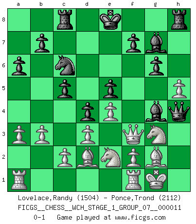 Last move : 0-1 2012 December 2 15:43:33 [Event "FICGS__CHESS__WCH_STAGE_1_GROUP_07__000011"] [Site "FICGS"] [Date "2012.12.01"] [Round "1"] [White "Lovelace,Randy"] [Black "Ponce,Trond"] [Result "0-1"] [WhiteElo "1504"] [BlackElo "2112"] 1.e4 c6 2.Nc3 d5 3.Qf3 d4 4.Nce2 c5 5.d3 Nc6 6.a3 Nf6 7.h3 e5 8.g4 Be6 9.Ng3 h6 10.Bg2 Rc8 11.N1e2 g6 12.Bd2 Bg7 13.O-O a6 14.b3 Qe7 15.Kh2 Nxg4+ 16.hxg4 h5 17.gxh5 Qh4+ 18.Kg1 Bg4 0-1 Caro-Kann : GOldman (Spielmann) variation Kingside Castling by player White (move 13) Player Black won this chess game. Follow this game move after move (download)There must have been a time when men were demigods, or they could not have invented Chess. (Gustav Schenk) Es genügt nicht ein guter Spieler zu sein, man muß auch gut spielen. (Siegbert Tarrasch) El Ajedrez es parte de una cultura y si una cultura esta en decadencia, entonces también el Ajedrez declinará. (Mikhail Botvinnik) Echiquier : carré parfait, comme la Jérusalem nouvelle décrite par l'auteur de l'Apocalypse, huit cases sur huit, exaltation du chiffre 4, symbole du cosmos aux quatre horizons... où le noir et le blanc, l'ombre et la lumière, le mal et le bien s'entremêlent et se conjuguent. (Robert Couffignal, Le Gambit du poète) The modern world has divided itself into Conservatives and Progressives. The business of Progressives is to go on making mistakes. The business of the Conservatives is to prevent the mistakes from being corrected. (G.K. Chesterton)