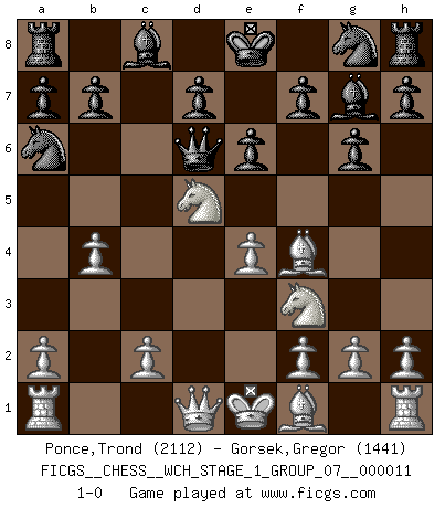 Last move : 1-0 2013 January 3 11:31:8 [Event "FICGS__CHESS__WCH_STAGE_1_GROUP_07__000011"] [Site "FICGS"] [Date "2012.11.01"] [Round "1"] [White "Ponce,Trond"] [Black "Gorsek,Gregor"] [Result "1-0"] [WhiteElo "2112"] [BlackElo "1441"] 1.e4 g6 2.d4 Bg7 3.Nc3 c5 4.dxc5 Qa5 5.Bd2 Qxc5 6.Nd5 Na6 7.Be3 Qa5+ 8.Bd2 Qc5 9.Nf3 e6 10.b4 Qd6 11.Bf4 1-0 This chess game has been lost on time (started : 2012.11.01 17:18:5) Robatsch defense Player White won this chess game. Follow this game move after move (download)Help your pieces so they can help you. (Paul Morphy) Je mehr ich von der FIDE weiss, um so weniger verstehe ich. (Alexander Kalifman) El Ajedrez es un juego de pelea el cual es puramente intelectual e incluye la suerte. (Richard Reti) Il n'y a pas eu de défaite parce que je ne crois pas que cet ordinateur ait jamais existé. IBM a triché en refusant d'imprimer les modes de recherche de la machine. C'est évident, pendant le match, des coups décisifs ont été joués par des êtres humains. Aujourd'hui, les meilleurs spécialistes en informatique ne peuvent toujours pas expliquer comment Deep-Blue a pu jouer contre la logique des ordinateurs. IBM a gagné une guerre de communication, mais ils sont incapables de prouver que l'ordinateur a gagné tout seul. (Garry Kasparov) You cannot beat a roulette table unless you steal money from it. (Albert Einstein)