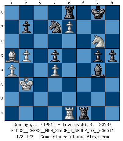 Last move : 1/2-1/2 2013 April 2 21:42:46 [Event "FICGS__CHESS__WCH_STAGE_1_GROUP_07__000011"] [Site "FICGS"] [Date "2012.11.01"] [Round "1"] [White "Domingo,Jordi"] [Black "Teverovski,Bogoljub"] [Result "1/2-1/2"] [WhiteElo "1981"] [BlackElo "2093"] 1.b4 d5 2.Bb2 Nf6 3.e3 e5 4.a3 Bd6 5.Nf3 Qe7 6.c4 c6 7.cxd5 cxd5 8.Nc3 Nc6 9.d4 e4 10.Nd2 O-O 11.Be2 Qe6 12.Qb3 Rd8 13.O-O-O Ne7 14.h3 a5 15.b5 h5 16.a4 Qf5 17.f3 exf3 18.gxf3 Qg5 19.e4 Bb4 20.Kb1 Be6 21.e5 Nd7 22.Bd3 Nb6 23.f4 Qg2 24.Ne2 Bxd2 25.Rhg1 Qxh3 26.Rxd2 Bf5 27.R2d1 Nc4 28.Ng3 Bg4 29.Bc1 g6 30.Rde1 Nf5 31.Bxf5 Bxf5+ 32.Ka2 Bg4 33.f5 Rac8 34.fxg6 fxg6 35.Ne2 Qxb3+ 36.Kxb3 Rf8 37.Nf4 Nb6 38.e6 Rf6 39.e7 Re8 40.Bd2 Rf5 41.Rgf1 g5 42.Ng6 Nd7 43.Bxa5 Rxf1 1/2-1/2 Polish (Sokolsky) opening Kingside Castling by player Black (move 10) Queenside Castling by player White (move 13) This chess game ended in a draw. Follow this game move after move (download)Bobby is the most misunderstood, misquoted celebrity walking the face of this earth. (Yasser Seirawan) Wenn es im Universum noch irgendwo intelligente Lebewesen gibt, dann kennen sie Go. (Emanuel Lasker) Jugadores de primera clase pierden en contra de jugadores de segunda clase porque los jugadores de segunda clase a veces juegan una partida de primer clase. (Siegbert Tarrasch) Avant la finale, les dieux ont créé le milieu de partie. (Tarrasch) Logic : The art of thinking and reasoning in strict accordance with the limitations and incapacities of the human misunderstanding. (Ambrose Bierce)