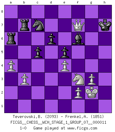 Last move : 1-0 2013 March 13 3:33:19 [Event "FICGS__CHESS__WCH_STAGE_1_GROUP_07__000011"] [Site "FICGS"] [Date "2012.11.01"] [Round "1"] [White "Teverovski,Bogoljub"] [Black "Frenkel,Alex"] [Result "1-0"] [WhiteElo "2093"] [BlackElo "1851"] 1.d4 Nf6 2.c4 c5 3.d5 b5 4.cxb5 a6 5.bxa6 g6 6.Nc3 Bxa6 7.Nf3 Qa5 8.Bd2 Bg7 9.e4 Bxf1 10.Kxf1 O-O 11.g3 d6 12.Kg2 Nbd7 13.a4 Rfb8 14.Nb5 Qb6 15.Qc2 Ne8 16.Rab1 Ra6 17.b3 Rba8 18.Na3 e6 19.dxe6 fxe6 20.Rhe1 Qd8 21.Rbd1 Qe7 22.Nb5 Bf6 23.h4 Bg7 24.Bg5 Qf8 25.Bf4 Qe7 26.Rd3 e5 27.Qc4+ Kh8 28.Bg5 Ndf6 29.h5 gxh5 30.Rh1 Qf8 31.Bxf6 Bxf6 32.Rxh5 Ng7 33.Rh1 Qe7 34.Rh6 Ne8 35.Rd1 Rb8 36.Rdh1 Rb7 37.Nc7 Nxc7 38.Rxh7+ Qxh7 39.Rxh7+ Kxh7 40.Qf7+ 1-0 Benko gambit accepted Kingside Castling by player Black (move 10) Player White won this chess game. Follow this game move after move (download)Alekhine is a poet who creates a work of art out of something that would hardly inspire another man to send home a picture post card. (Max Euwe) Rauchen ist dem Schachspieler bei seiner Arbeit, also im Wettkampf, untersagt. (Viktor Kortschnoi) Fischer es una tragedia del Ajedrez Americano a la par con Morphy y Pillsbury. (Mig Greengard) La tactique est l'élément le plus important du milieu de jeu. (Siegbert Tarrasch) A bird doesn't sing because it has an answer, it sings because it has a song. (Maya Angelou)