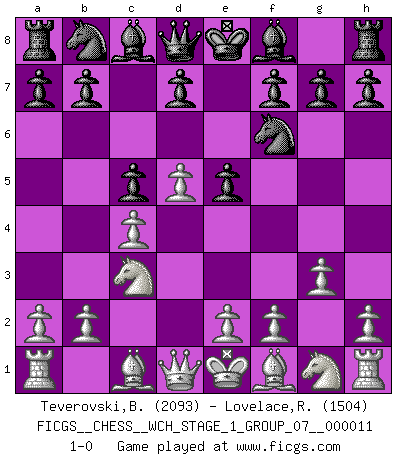 Last move : 1-0 2013 January 21 0:38:40 [Event "FICGS__CHESS__WCH_STAGE_1_GROUP_07__000011"] [Site "FICGS"] [Date "2012.12.01"] [Round "1"] [White "Teverovski,Bogoljub"] [Black "Lovelace,Randy"] [Result "1-0"] [WhiteElo "2093"] [BlackElo "1504"] 1.d4 Nf6 2.c4 e6 3.g3 c5 4.d5 e5 5.Nc3 1-0 This chess game has been lost on time (started : 2012.12.01 0:39:31) Catalan Opening Player White won this chess game. Follow this game move after move (download)Chess is the gymnasium of the mind. (Blaise Pascal) Obwohl ich vom Stil her kaum zu den Priestern der Schachkunst gezählt werde, halte ich Schach doch für eine Kunst. (Tigran Petrosjan) Botvinnik trataba de restarle el misterio al Ajedrez, siempre relacionandolo a situaciones de la vida ordinaria. El gustaba de llamar al Ajedrez un típico problema inexacto similar a aquellos de los cuales la gente siempre tiene que enfrentarse en la vida cotidiana. (Garry Kasparov) L'ordinateur a tué l'originalité. Il n'y a plus guère d'aventures sur l'échiquier. (Jacob Murray) Creativity is allowing yourself to make mistakes. Art is knowing which ones to keep. (Scott Adams)