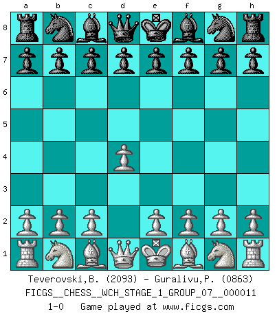 Last move : 1-0 2012 December 2 23:28:21 [Event "FICGS__CHESS__WCH_STAGE_1_GROUP_07__000011"] [Site "FICGS"] [Date "2012.11.01"] [Round "1"] [White "Teverovski,Bogoljub"] [Black "Guralivu,Paul-Iosif"] [Result "1-0"] [WhiteElo "2093"] [BlackElo "0863"] 1.d4 1-0 This chess game has been lost on time (started : 2012.11.01 17:18:5) Queen's pawn Player White won this chess game. Follow this game move after move (download)Some part of a mistake is always correct. (Savielly Tartakover) Der Traum, für den ich lebe, ist der von einem freien Russland. Viele mögen sagen: Russland hat doch ein Parlament, einen gewählten Präsidenten. Aber ich spüre, dass in meiner Heimat die Angst wiederkehrt. Eine Angst, sich frei zu äußern, bestimmte Dinge zu tun (Garry Kasparov) Yo jugué Ajedrez con el y a veces le pude haber ganado solo que siempre devuelve su última jugada y juega la partida de manera diferente. (Mark Twain) Les Echecs sont et restent toujours un combat, un combat intégral comme la boxe, la lutte ou un autre sport, et où il doit y avoir un vainqueur et un vaincu. (Joseph Emil Diemer) Statistics can be made to prove anything - even the truth. (Author unknown)