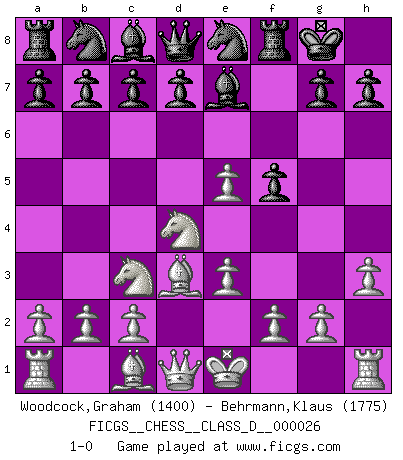 Last move : 1-0 2007 January 30 6:26:36 [Event "FICGS__CHESS__CLASS_D__000026"] [Site "FICGS"] [Date "2007.01.17"] [Round "1"] [White "Woodcock,Graham"] [Black "Behrmann,Klaus"] [Result "1-0"] [WhiteElo "1400"] [BlackElo "1775"] 1.d4 f5 2.e3 Nf6 3.Nf3 e6 4.h3 Be7 5.Bd3 O-O 6.Nc3 e5 7.dxe5 Ne8 8.Nd4 1-0 Dutch Kingside Castling by player Black (move 5) Player White won this chess game. Follow this game move after move (download)Life is like a game of Chess, changing with each move. (Chinese proverb) Heutzutage gewinnt im Turnier nicht derjenige Spieler, der weitreichende Pläne entwirft, sondern einfach jener, der Zug um Zug kämpft. (David Bronstein) No todos los artistas son jugadores de Ajedrez, pero todos los jugadores de Ajedrez son artistas. (Marcel Duchamp) Les échecs sont un jeu terrible. Si vous n'avez pas le centre, votre adversaire a une position plus libre. Par contre, si vous avez le centre, alors vous avez vraiment quelque chose pour laquelle vous inquiéter ! (Siegbert Tarrasch) Animated gif is worth one mega-word. (Unknown)