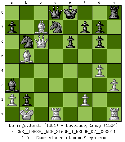 Last move : 1-0 2012 December 3 2:49:29 [Event "FICGS__CHESS__WCH_STAGE_1_GROUP_07__000011"] [Site "FICGS"] [Date "2012.12.01"] [Round "1"] [White "Domingo,Jordi"] [Black "Lovelace,Randy"] [Result "1-0"] [WhiteElo "1981"] [BlackElo "1504"] 1.e4 d5 2.exd5 Nf6 3.d4 Nxd5 4.Nf3 Bg4 5.h3 Bh5 6.c4 Nb6 7.Nc3 e6 8.g4 Bg6 9.Ne5 N8d7 10.Nxg6 hxg6 11.c5 Nc8 12.Bf4 c6 13.Qb3 b6 14.O-O-O bxc5 15.Qb7 cxd4 16.Qxa8 dxc3 17.Qxc6 cxb2+ 18.Kb1 Ncb6 19.Bb5 Ba3 20.Bc7 1-0 Scandinavian : Marshall variation Queenside Castling by player White (move 14) Player White won this chess game. Follow this game move after move (download)Chess holds its master in its own bonds, shackling the mind and brain so that the inner freedom of the very strongest must suffer. (Albert Einstein) Ein Isolani verdüstert die Stimmung auf dem ganzen Schachbrett. (Savielly Grigorievitsch Tartakower) No hay un Gran Maestro de Ajedrez que sea normal; solo se diferencían ellos por la magnitud de su locura. (Viktor Korchnoi) Vous n'êtes pas toujours obligé de jouer le meilleur coup. Un coup doit être actif, entreprenant, correct et beau ! (David Bronstein) Knowledge will give you power, but character respect. (Bruce Lee)
