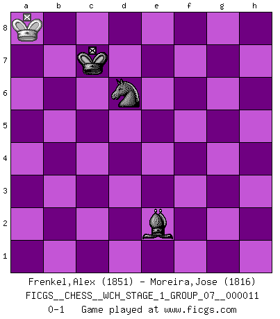 Last move : 0-1 2013 February 15 0:32:26 [Event "FICGS__CHESS__WCH_STAGE_1_GROUP_07__000011"] [Site "FICGS"] [Date "2012.11.01"] [Round "1"] [White "Frenkel,Alex"] [Black "Moreira,Jose"] [Result "0-1"] [WhiteElo "1851"] [BlackElo "1816"] 1.e4 c5 2.Nf3 d6 3.d4 cxd4 4.Nxd4 Nf6 5.Nc3 a6 6.Be3 e5 7.Nb3 Be6 8.Qd2 Be7 9.f3 Nbd7 10.g4 b5 11.O-O-O h6 12.Kb1 Nb6 13.Qf2 Nfd7 14.Bd3 Nc4 15.Bxc4 bxc4 16.Nc1 Rb8 17.N1e2 Qc7 18.h4 Qb7 19.Bc1 O-O 20.g5 h5 21.f4 exf4 22.Nxf4 Bg4 23.Rd4 Ne5 24.Ncd5 Bd8 25.c3 Qc6 26.Rf1 Nf3 27.R4d1 Qe8 28.Ka1 Qxe4 29.Qa7 Rb5 30.Qxa6 Qe8 31.Qxd6 Nxh4 32.Rfe1 Nf5 33.Qa6 Ra5 34.Nf6+ gxf6 35.Rxe8 Rxa6 36.R1xd8 Rxe8 37.Rxe8+ Kg7 38.gxf6+ Kxf6 39.Nd5+ Kg7 40.Bf4 h4 41.Be5+ f6 42.Nxf6 Kf7 43.Rh8 Rxf6 44.Bxf6 Kxf6 45.b4 cxb3 46.axb3 h3 47.Rxh3 Bxh3 48.Kb2 Nd6 49.Ka3 Ne4 50.Kb2 Ke5 51.Kc2 Bf1 52.Kb2 Bd3 53.b4 Kd5 54.Kb3 Bb5 55.c4+ Bxc4+ 56.Ka4 Nc3+ 57.Ka5 Kc6 58.b5+ Nxb5 59.Kb4 Bd5 60.Ka5 Kc5 61.Ka4 Bc4 62.Ka5 Bb3 63.Ka6 Nd6 64.Ka5 Nb7+ 65.Ka6 Kc6 66.Ka7 Kc7 67.Ka6 Bc4+ 68.Ka7 Nd6 69.Ka8 Be2 0-1 Sicilian : Najdorf, Byrne (English) attack Queenside Castling by player White (move 11) Kingside Castling by player Black (move 19) 10 pieces endgame at move 44 : White KRPPP , Black KBNPP WHITE : King + 1 Rook 3 Pawns BLACK : King + 1 Bishop 1 Knight 2 Pawns 9 pieces endgame at move 45 : White KRPP , Black KBNPP WHITE : King + 1 Rook 2 Pawns BLACK : King + 1 Bishop 1 Knight 2 Pawns 8 pieces endgame at move 46 : White KRPP , Black KBNP WHITE : King + 1 Rook 2 Pawns BLACK : King + 1 Bishop 1 Knight 1 Pawn 7 pieces endgame at move 47 : White KRPP , Black KBN WHITE : King + 1 Rook 2 Pawns BLACK : King + 1 Bishop 1 Knight 6 pieces endgame at move 47 : White KPP , Black KBN WHITE : King + 2 Pawns BLACK : King + 1 Bishop 1 Knight 5 pieces endgame at move 55 : White KP , Black KBN WHITE : King + 1 Pawn BLACK : King + 1 Bishop 1 Knight 4 pieces endgame at move 58 : White K , Black KBN WHITE : King + BLACK : King + 1 Bishop 1 Knight Player Black won this chess game. Follow this game move after move (download)Avoid the crowd. Do your own thinking independently. Be the Chess player, not the Chess piece. (Ralph Charell) Modernes Schach erfordert enorme Anspannung. Es ist für einen normalen Menschen unmöglich das auszuhalten. (Viktor Kortschnoi) No volvere nunca a jugar contigo. Has insultado a mi amigo. - cuando un oponente se maldijo por una mala jugada (Miguel Najdorf) Les écrivains ont utilisé les échecs pour analyser les côtés extrêmes de la nature humaine. Dans ce cadre, les échecs offrent un champ d'expérimentation idéal. Mais on pourrait faire la même chose avec la peinture. Et là, en vous référant à Van Gogh, vous ne tirerez pas de conclusion définitive sur les peintres. (Gary Kasparov) I couldn't make any sense out of what this particular thread is about. It sounds like R2 D2 computer speaking. A space fight ?!? Some 'command' problems in Moscow ? Some killers & narcotic addicts attacking some game & a god wannabe ?? (Dinesh De Silva, lost in a russian conflict in FICGS forum)