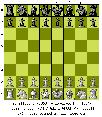Last move : 0-1 2013 January 7 11:45:36 [Event "FICGS__CHESS__WCH_STAGE_1_GROUP_07__000011"] [Site "FICGS"] [Date "2012.12.01"] [Round "1"] [White "Guralivu,Paul-Iosif"] [Black "Lovelace,Randy"] [Result "0-1"] [WhiteElo "0863"] [BlackElo "1504"] 0-1 This chess game has been lost on time (started : 2012.12.01 0:39:31) Player Black won this chess game. Follow this game move after move (download)A bad plan is better than none at all. (Frank Marshall) Schach ist Leben. (Robert James Fischer) Aquel que teme a un Peón de Reina aislado, debería de retirarse del Ajedrez. (Siegbert Tarrasch) 'L'échange des dames est un coup dur pour les deux adversaires...' Un journaliste lors d'une partie du match Spassky-Fischer The obstacle is the path. (Zen proverb)