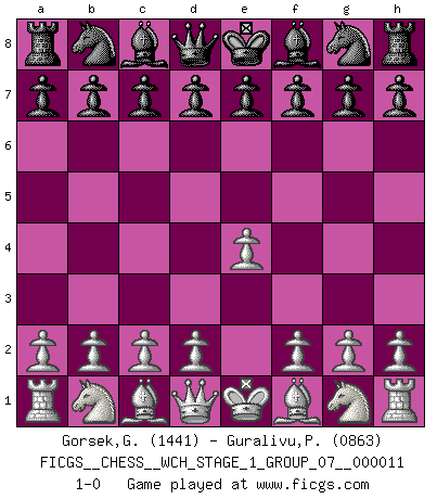 Last move : 1-0 2012 December 2 11:27:41 [Event "FICGS__CHESS__WCH_STAGE_1_GROUP_07__000011"] [Site "FICGS"] [Date "2012.11.01"] [Round "1"] [White "Gorsek,Gregor"] [Black "Guralivu,Paul-Iosif"] [Result "1-0"] [WhiteElo "1441"] [BlackElo "0863"] 1.e4 1-0 This chess game has been lost on time (started : 2012.11.01 17:18:5) King's pawn Opening Player White won this chess game. Follow this game move after move (download)The mistakes are there, waiting to be made. (Savielly Tartakower) Es genügt nicht ein guter Spieler zu sein, man muß auch gut spielen. (Siegbert Tarrasch) El Ajedrez, como cualquier actividad creativa, solo puede existir a través del esfuerzo combinado de aquellos que tienen talento creativo y de aquellos que poseen la habilidad de organizar su trabajo creativo. (Mikhail Botvinnik) Les échecs, c'est la lutte contre l'erreur. (Johannes Zukertort) The difference between stupidity and genius is that genius has its limits. (Murphy)