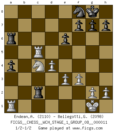 Last move : 1/2-1/2 2012 December 4 5:12:10 [Event "FICGS__CHESS__WCH_STAGE_1_GROUP_08__000011"] [Site "FICGS"] [Date "2012.11.01"] [Round "1"] [White "Endean,Andrew"] [Black "Bellegotti,Giorgio"] [Result "1/2-1/2"] [WhiteElo "2110"] [BlackElo "2098"] 1.d4 d5 2.c4 c6 3.Nf3 e6 4.Nc3 dxc4 5.a4 Bb4 6.e3 b5 7.Bd2 a5 8.axb5 Bxc3 9.Bxc3 cxb5 10.b3 Bb7 11.bxc4 b4 12.Bb2 Nf6 13.Bd3 O-O 14.O-O Nbd7 15.Nd2 Qc7 16.f3 Bc6 17.Bc2 Qa7 18.Ba4 Qa6 19.Qc2 Bxa4 20.Qxa4 Nb6 21.Qb3 Rfb8 22.Rfb1 Nfd7 23.Rc1 a4 24.Qxb4 Nxc4 25.Qxc4 Rxb2 26.Qxa6 Rxa6 27.Rc8+ Nf8 28.Nc4 Rc2 29.Rc5 1/2-1/2 QGD Slav : 3.Nf3 Kingside Castling by player Black (move 13) Kingside Castling by player White (move 14) This chess game ended in a draw. Follow this game move after move (download)We cannot resist the fascination of sacrifice, since a passion for sacrifices is part of a Chessplayer's nature. (Rudolf Spielman) Kritik überlasse ich den Spießern. Ich zeige nichts, wofür ich mich schämen muss. (Alexandra Kosteniuk) Juega la Apertura como un libro, el Juego Medio como un mago y los Finales como una máquina. (Spielmann) Les échecs sont un jeu par leur forme, un art par leur essence et une science par sa difficulté d'acquisition. Ils peuvent vous procurer autant de plaisir qu'un bon livre ou une belle musique, mais vous n'aurez une réelle joie que si vous arrivez à bien jouer. (Tigran Petrosian) Every vice is only an exaggeration of a necessary and virtuous function. (Ralph Waldo Emerson, Journals 1936)
