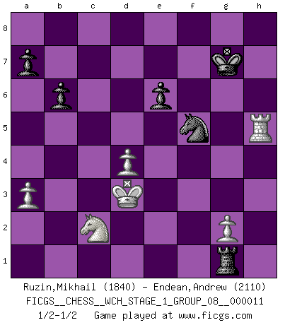 Last move : 1/2-1/2 2013 February 15 3:37:34 [Event "FICGS__CHESS__WCH_STAGE_1_GROUP_08__000011"] [Site "FICGS"] [Date "2012.11.01"] [Round "1"] [White "Ruzin,Mikhail"] [Black "Endean,Andrew"] [Result "1/2-1/2"] [WhiteElo "1840"] [BlackElo "2110"] 1.d4 Nf6 2.c4 e6 3.Nc3 Bb4 4.Qc2 O-O 5.Bg5 c5 6.a3 Bxc3+ 7.bxc3 h6 8.Bh4 cxd4 9.cxd4 Qa5+ 10.Qd2 Qxd2+ 11.Kxd2 g5 12.Bg3 Ne4+ 13.Ke1 b6 14.e3 Nc6 15.Bd3 Nxg3 16.hxg3 Kg7 17.Nf3 Bb7 18.Nd2 Rac8 19.Ke2 Na5 20.f3 Rc7 21.Rh5 Ba6 22.Rah1 Rh8 23.f4 f6 24.fxg5 fxg5 25.Ne4 Bxc4 26.Nxg5 Bxd3+ 27.Kxd3 Nc4 28.Nf3 Nb2+ 29.Kd2 Rhc8 30.Ne1 Nc4+ 31.Ke2 Rh8 32.g4 Nd6 33.g5 Nf7 34.gxh6+ Rxh6 35.Rxh6 Nxh6 36.e4 Nf7 37.e5 d6 38.exd6 Nxd6 39.Rh5 Nf5 40.Kd3 Rc1 41.Nc2 Rg1 1/2-1/2 Nimzo-Indian : Classical variation Kingside Castling by player Black (move 4) This chess game ended in a draw. Follow this game move after move (download)The Pawns are the soul of the game. (Francois Andre Danican Philidor) Fischer: 'Remis!?' Uhlmann: 'Aber es muss doch dreimal Zugwiederholung sein!' Fischer: 'Sie nehmen das Remis an, wie ich es sage, sonst spiele ich weiter und werde Sie dann schlagen!' (Robert James Fischer) Bobby es el jugador de Ajedrez mas fino que este país jamás haya producido. Su memoria para las movidas, su brillantez en soñar combinaciones y su feróz determinación por la victoria son algo extraño. (John Collins) Il n'y a plus de joueurs du niveau de Jacob Murray dont la seule quête est le beau jeu, le plaisir de voir les pièces construire quelque chose. Sur 10 idées à la minute, 9 seront sans intérêt, la dernière s'avèrera géniale. (Christian Bauer) A specialist learns more and more about less and less until he knows everything about nothing. (Nicholas Murray Butler)