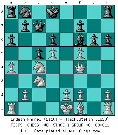 Last move : 1-0 2013 January 22 21:14:59 [Event "FICGS__CHESS__WCH_STAGE_1_GROUP_08__000011"] [Site "FICGS"] [Date "2012.11.01"] [Round "1"] [White "Endean,Andrew"] [Black "Haack,Stefan"] [Result "1-0"] [WhiteElo "2110"] [BlackElo "1820"] 1.d4 Nf6 2.c4 c5 3.d5 e6 4.Nc3 exd5 5.cxd5 d6 6.Nf3 Bg4 7.Nd2 g6 8.Nc4 Be7 9.Bh6 a6 10.a4 Bf8 11.Qd2 Qe7 12.Bf4 Qc7 13.Qe3+ Kd8 14.Bg5 Bg7 15.Qf4 Bf5 16.g4 h6 17.Bxf6+ Bxf6 18.gxf5 1-0 Benoni defense Player White won this chess game. Follow this game move after move (download)Chess makes man wiser and clear-sighted. (Vladimir Putin) Wenn ich mich einlogge, glauben die Leute gewöhnlich nicht, dass ich es selbst bin und sie fangen an, mir dumme Fragen zu stellen. Und wenn sie es glauben, stellen sie wieder andere dumme Fragen. (Judith Polgar) Si no le temes a Spassky, entonces elimino el elemento del dinero. (Jim Slater) Un millionnaire : 'Monsieur Steinitz ! Vous ne participez aux tournois que pour l'argent, alors que moi je n'y viens que pour l'honneur.' Steinitz : 'Chacun joue pour ce qu'il n'a pas'... Luck is what you have left over after you give 100 percent. (Langston Coleman)