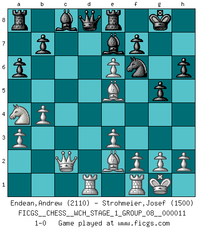 Last move : 1-0 2013 January 30 21:44:47 [Event "FICGS__CHESS__WCH_STAGE_1_GROUP_08__000011"] [Site "FICGS"] [Date "2012.11.01"] [Round "1"] [White "Endean,Andrew"] [Black "Strohmeier,Josef"] [Result "1-0"] [WhiteElo "2110"] [BlackElo "1500"] 1.d4 Nf6 2.c4 e6 3.Nc3 Bb4 4.Qc2 c5 5.dxc5 O-O 6.a3 Bxc5 7.Nf3 Nc6 8.Bg5 h6 9.Bh4 a6 10.e3 Be7 11.Be2 Re8 12.O-O d5 13.Rad1 g5 14.Bg3 Kg7 15.Ne5 Nxe5 16.Bxe5 Kg8 17.cxd5 Qb6 18.Na4 Qa5 19.b4 Qd8 20.dxe6 1-0 Nimzo-Indian : Classical, Pirc variation Kingside Castling by player Black (move 5) Kingside Castling by player White (move 12) Player White won this chess game. Follow this game move after move (download)Pawns are born free, yet they are everywhere in chains. (Rick Kennedy) Kasparov ist eine Art Monster mit hundert Augen, denen auch nicht das Geringste entgeht. (Tony Miles) La señal de un Gran Maestro es su habilidad de ganar una partida rápidamente y sin dolor. (Irving Chernev) J'ai vu le vaincu d'Echecs jouer des années durant dans l'espoir de la fête de la victoire. Car tu es plus riche de ce qu'elle existe si même elle n'est point pour toi. Ainsi de la perle du fond des mers. (Antoine de Saint-Exupéry) The hypothalamus is one of the most important parts of the brain, involved in many kinds of motivation, among other functions. The hypothalamus controls the 'Four Fs: Fighting, Fleeing, Feeding and Mating. (Unknown author)