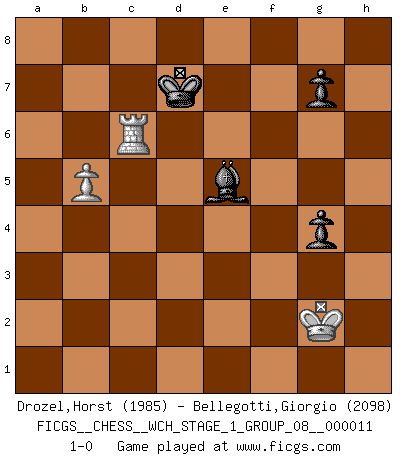 Last move : 1-0 2013 April 9 4:12:13 [Event "FICGS__CHESS__WCH_STAGE_1_GROUP_08__000011"] [Site "FICGS"] [Date "2012.11.01"] [Round "1"] [White "Drozel,Horst"] [Black "Bellegotti,Giorgio"] [Result "1-0"] [WhiteElo "1985"] [BlackElo "2098"] 1.e4 e5 2.Nf3 Nc6 3.Bb5 a6 4.Ba4 Nf6 5.O-O Be7 6.Re1 b5 7.Bb3 O-O 8.d4 d6 9.c3 Bg4 10.Be3 exd4 11.cxd4 Na5 12.Bc2 c5 13.h3 Bh5 14.g4 Bg6 15.Nbd2 Nd7 16.Qe2 Qc7 17.Rac1 h6 18.Bf4 Nc6 19.Bb1 Qb6 20.d5 Nce5 21.Nxe5 Nxe5 22.Bg3 Nd7 23.f4 Rfe8 24.h4 f6 25.Nf3 Rac8 26.Qg2 Qd8 27.Kh2 Bf8 28.g5 Bh5 29.e5 dxe5 30.Bf5 e4 31.Nd2 hxg5 32.hxg5 e3 33.Ne4 fxg5 34.Qh3 Rxe4 35.Bxe4 Nf6 36.Bf5 g4 37.Qg2 Bf7 38.Rcd1 Rc7 39.Be6 c4 40.f5 Rd7 41.Bxd7 Qxd7 42.d6 Qxf5 43.Rxe3 Bd5 44.Rxd5 Nxd5 45.Re5 Qh7+ 46.Kg1 Nf6 47.Qd2 Qb1+ 48.Kg2 Qxa2 49.Rf5 b4 50.Qxb4 Qb3 51.Qxb3 cxb3 52.Rf2 Nd7 53.Re2 Kf7 54.Re3 Nf6 55.Rxb3 Ke6 56.Ra3 Ne8 57.Rxa6 Nxd6 58.b4 Kd7 59.Bxd6 Bxd6 60.b5 Be5 61.Rc6 1-0 Ruy Lopez : Closed, 7...O-O Kingside Castling by player White (move 5) Kingside Castling by player Black (move 7) 10 pieces endgame at move 57 : White KRBPP , Black KBNPP WHITE : King + 1 Rook 1 Bishop 2 Pawns BLACK : King + 1 Bishop 1 Knight 2 Pawns 9 pieces endgame at move 57 : White KRBP , Black KBNPP WHITE : King + 1 Rook 1 Bishop 1 Pawn BLACK : King + 1 Bishop 1 Knight 2 Pawns 8 pieces endgame at move 59 : White KRBP , Black KBPP WHITE : King + 1 Rook 1 Bishop 1 Pawn BLACK : King + 1 Bishop 2 Pawns 7 pieces endgame at move 59 : White KRP , Black KBPP WHITE : King + 1 Rook 1 Pawn BLACK : King + 1 Bishop 2 Pawns Player White won this chess game. Follow this game move after move (download)The most powerful weapon in Chess is to have the next move. (David Bronstein) Ich organisiere ein großes Turnier, was mich etwa 120000 Dollar kostet. Ich denke, das ist das erste Mal in der Schachgeschichte, daß ein Schachgroßmeister auch als Mäzen auftritt. (Miguel Najdorf) Si tu oponente te ofrece un empate, trata de averiguar porque piensa él que esta en una posición peor. (Nigel Short) Vous m'avez demandé de vous exposer quel est le fondement de la prière. Je ne fais que préparer les pièces du jeu sur la table... Nous sera-t-il permis d'en adopter les règles et si nous les appliquons scrupuleusement nous ne tarderons pas à faire mat le Roi divin ! Il ne pourra échapper à nos mains. (Sainte Thérèse d'Avila, Chemin de perfection) A good teacher is like a candle - it consumes itself to light the way for others. (Author unknown)