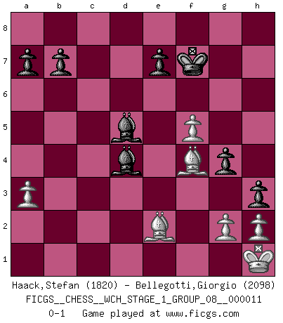Last move : 0-1 2013 January 6 16:32:11 [Event "FICGS__CHESS__WCH_STAGE_1_GROUP_08__000011"] [Site "FICGS"] [Date "2012.11.01"] [Round "1"] [White "Haack,Stefan"] [Black "Bellegotti,Giorgio"] [Result "0-1"] [WhiteElo "1820"] [BlackElo "2098"] 1.e4 c5 2.c3 Nf6 3.e5 Nd5 4.d4 cxd4 5.Nf3 Nc6 6.cxd4 d6 7.Nc3 dxe5 8.Nxe5 Nxc3 9.Nxc6 Nxd1 10.Nxd8 Nxb2 11.Nxf7 Kxf7 12.Bxb2 Be6 13.Bd3 Bd5 14.O-O g6 15.f4 Bg7 16.f5 g5 17.a3 Rac8 18.Rac1 h5 19.Rxc8 Rxc8 20.Rc1 Bxd4+ 21.Kh1 Rxc1+ 22.Bxc1 g4 23.Bf4 h4 24.Be2 h3 0-1 Sicilian : Alapin's variation (2.c3) Kingside Castling by player White (move 14) Player Black won this chess game. Follow this game move after move (download)I am still a victim of Chess. It has all the beauty of art and much more. It cannot be commercialized. Chess is much purer than art in its social position. (Marcel Duchamp) Wenn man heute mit 14 Jahren noch kein GM ist, kann man es vergessen. (Viswanathan Anand) No es tiempo de jugar al Ajedrez cuando la casa esta en llamas. (Proverbio Italiano) Les ravages du H expliquent la différence de niveau entre Tal et Thal [Abergel]. Difficult things take a long time, impossible things a little longer. (Author unknown)