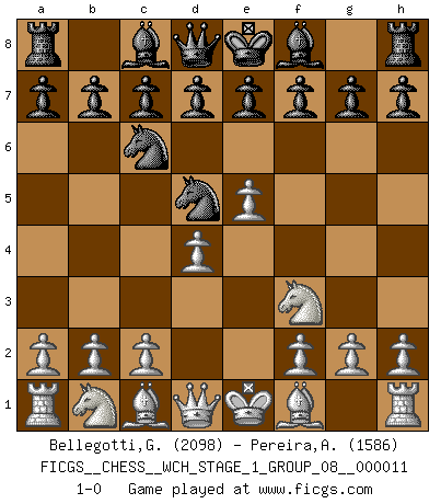 Last move : 1-0 2012 December 27 11:8:32 [Event "FICGS__CHESS__WCH_STAGE_1_GROUP_08__000011"] [Site "FICGS"] [Date "2012.11.01"] [Round "1"] [White "Bellegotti,Giorgio"] [Black "Pereira,Antonio"] [Result "1-0"] [WhiteElo "2098"] [BlackElo "1586"] 1.Nf3 Nc6 2.e4 Nf6 3.e5 Nd5 4.d4 1-0 This chess game has been lost on time (started : 2012.11.01 17:20:6) Reti Opening Player White won this chess game. Follow this game move after move (download)A Chess game is divided into three stages: the first, when you hope you have the advantage, the second when you believe you have an advantage, and the third... when you know you're going to lose ! (Savielly Tartakower) Ich verachte die Medien. (Robert James Fischer) En manos de Fischer's, una diminuta ventaja teórica es tan buena como tener una Reina de ventaja. (Isaac Kashdan) La guerre est enfant de la passion, la passion est enfant du narcissisme et le narcissisme est l'enfant. (...) Une autre partie ? (Thibault de Vassal) True nature is revealed in times of difficulty. (Chinese proverb)